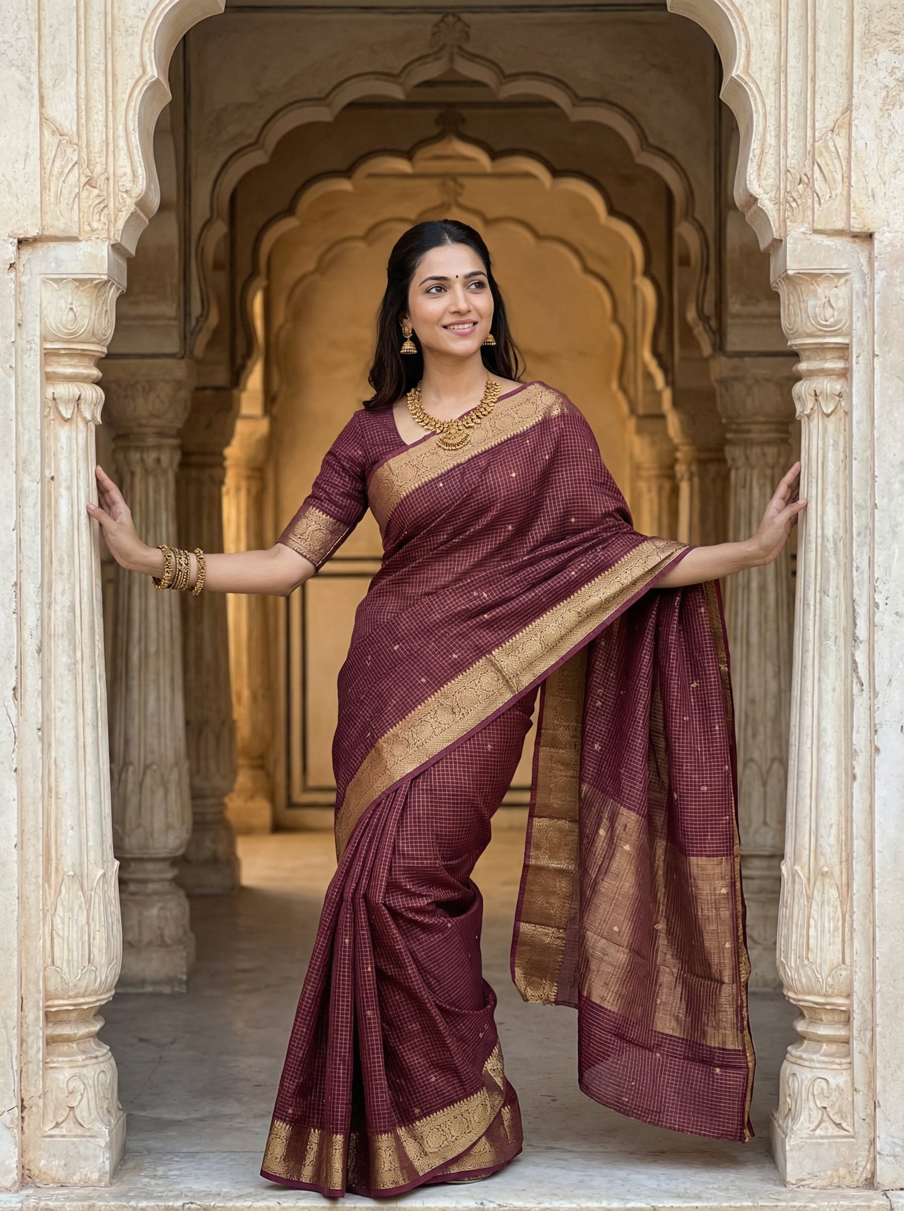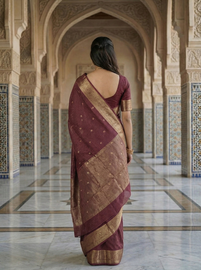 Gerogette Banarasi Maroon Saree with Gold Zari Butta and Rich Woven Border