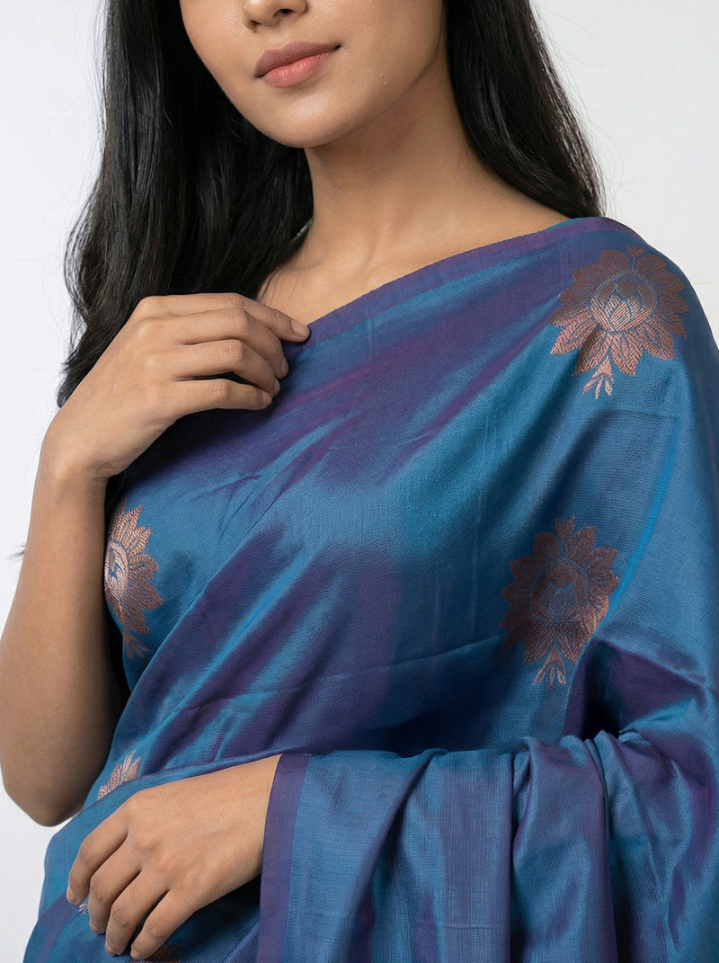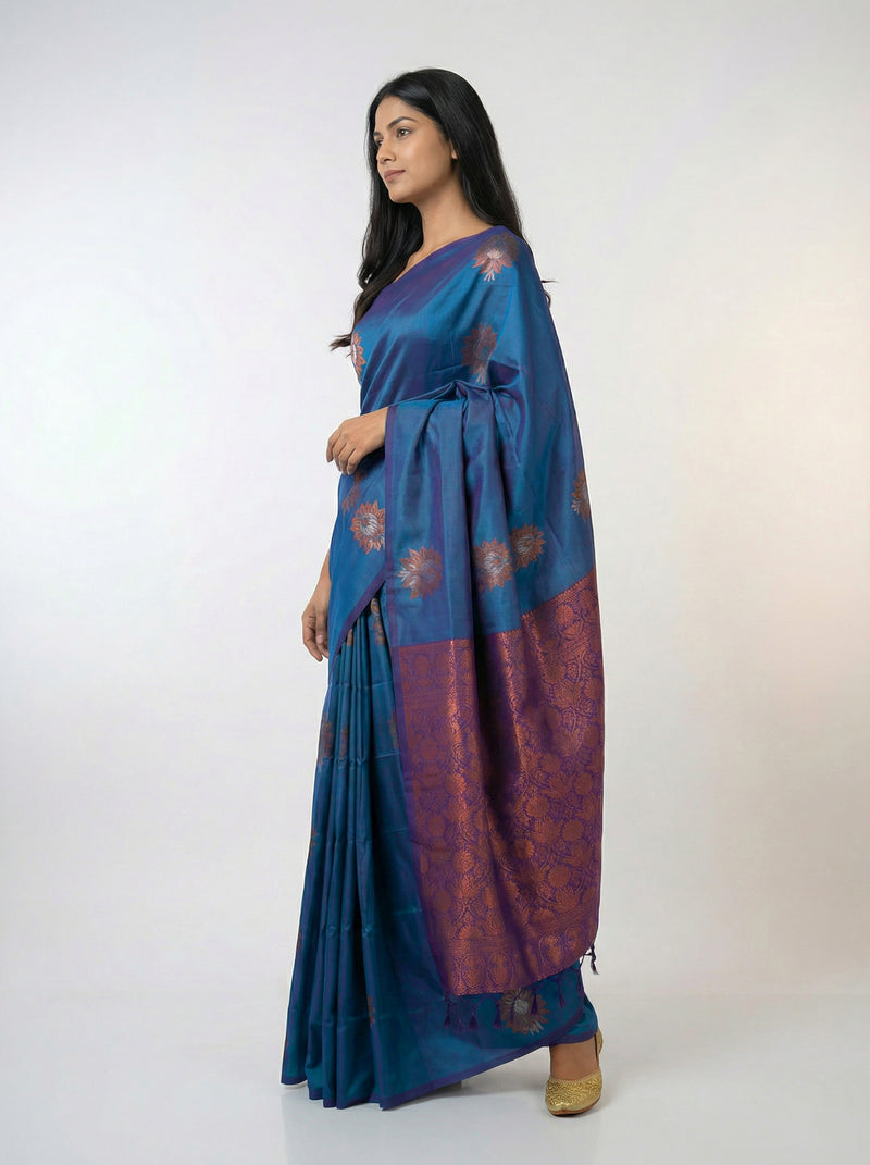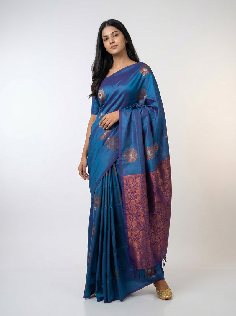 Semi Silk Peacock Blue Saree with Contrast Plum Violet Blouse