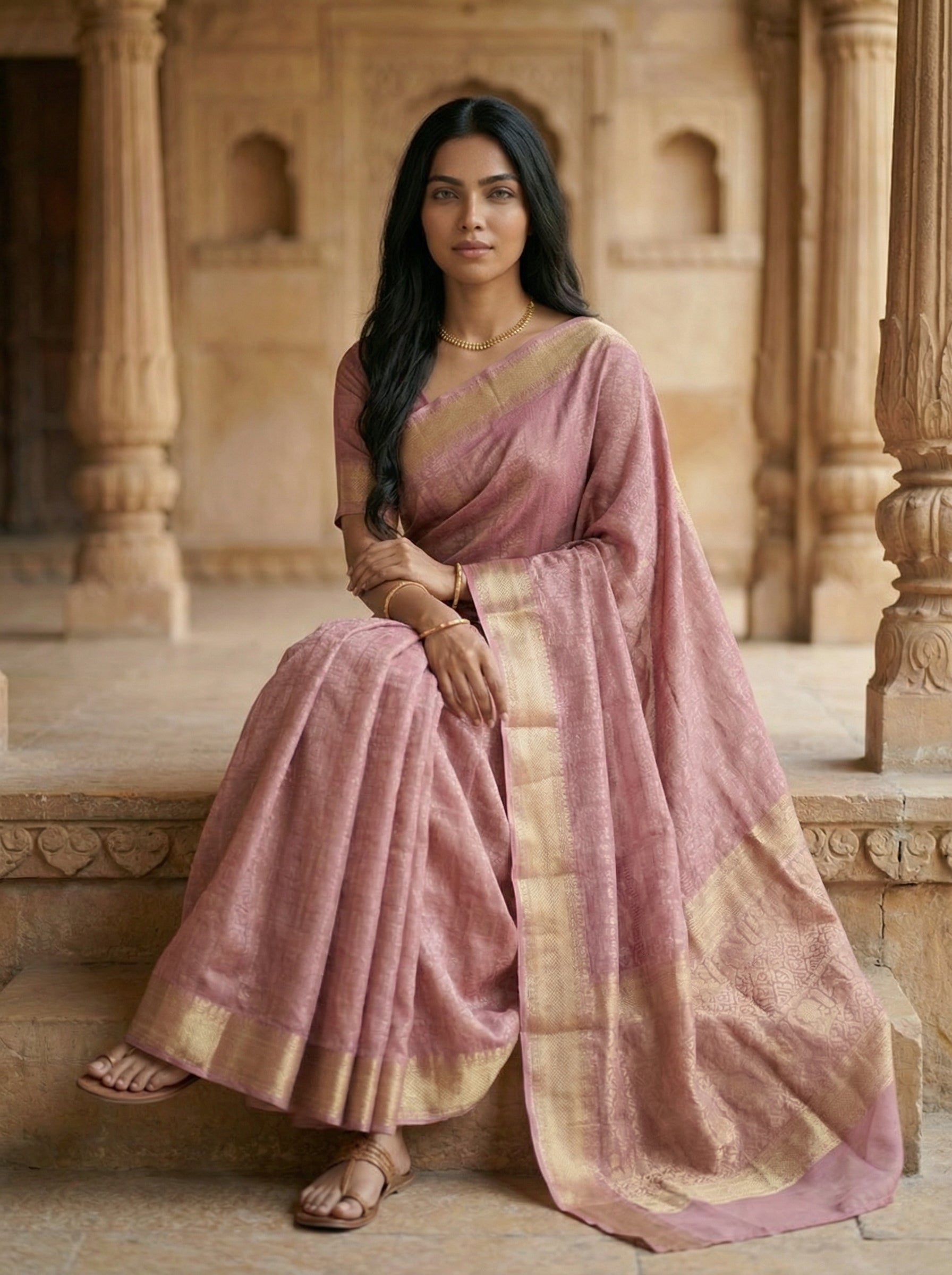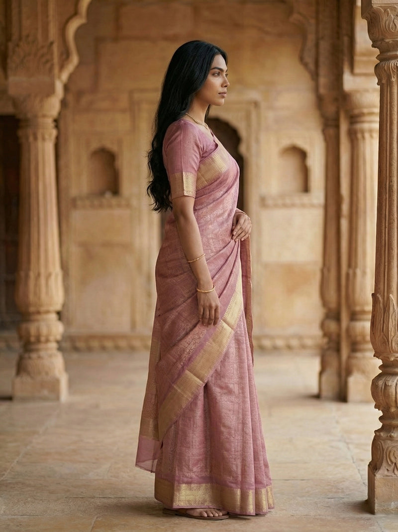 Drape yourself in timeless elegance with this stunning semi-silk pink saree, featuring intricate gold zari woven throughout. The luxurious blend of semi-silk fabric offers a perfect balance of comfort and sophistication, while the delicate gold threadwork adds a touch of traditional grandeur. Ideal for weddings, festivals, and special occasions, this saree effortlessly combines classic craftsmanship with contemporary style. The soft pink hue complements all skin tones, making it a versatile addition to your ethnic wardrobe.