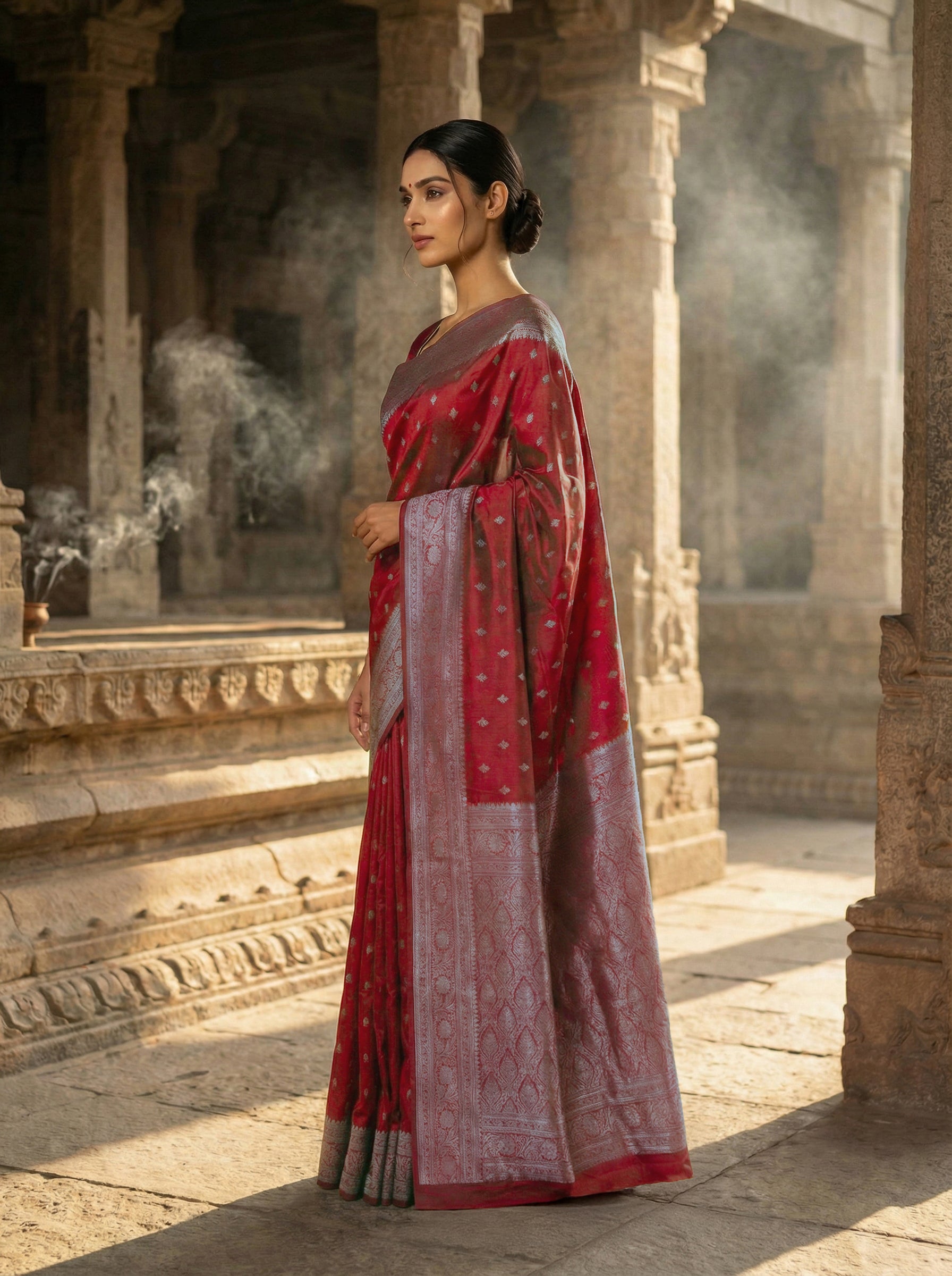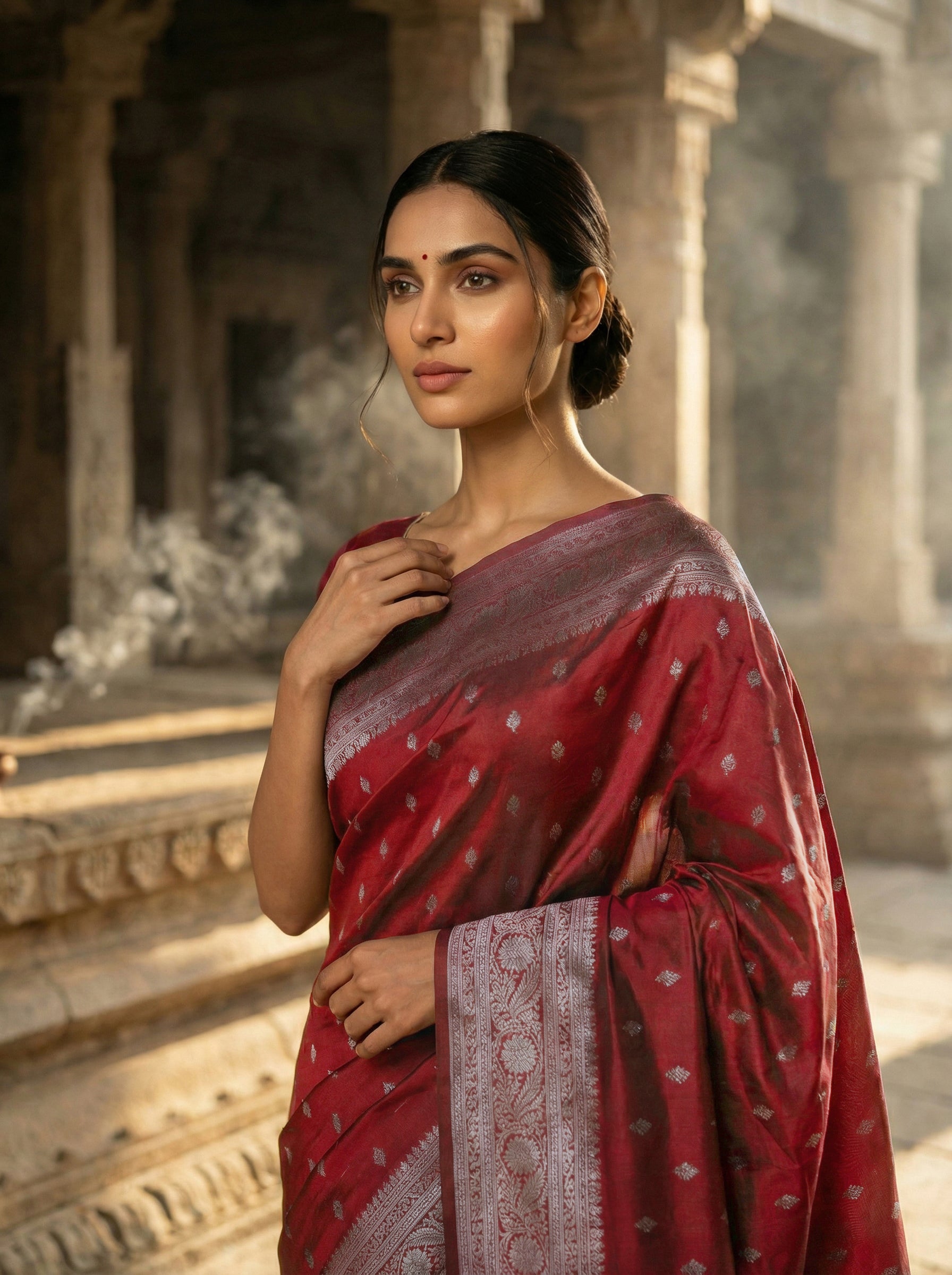 Semi Silk Saree in Maroon with Antique Silver Zari – Butta Body, Banarasi Pallu