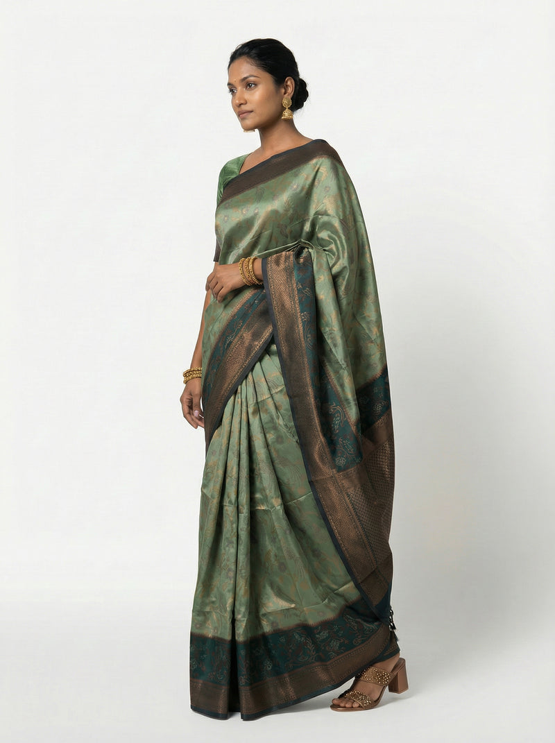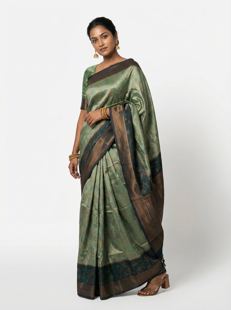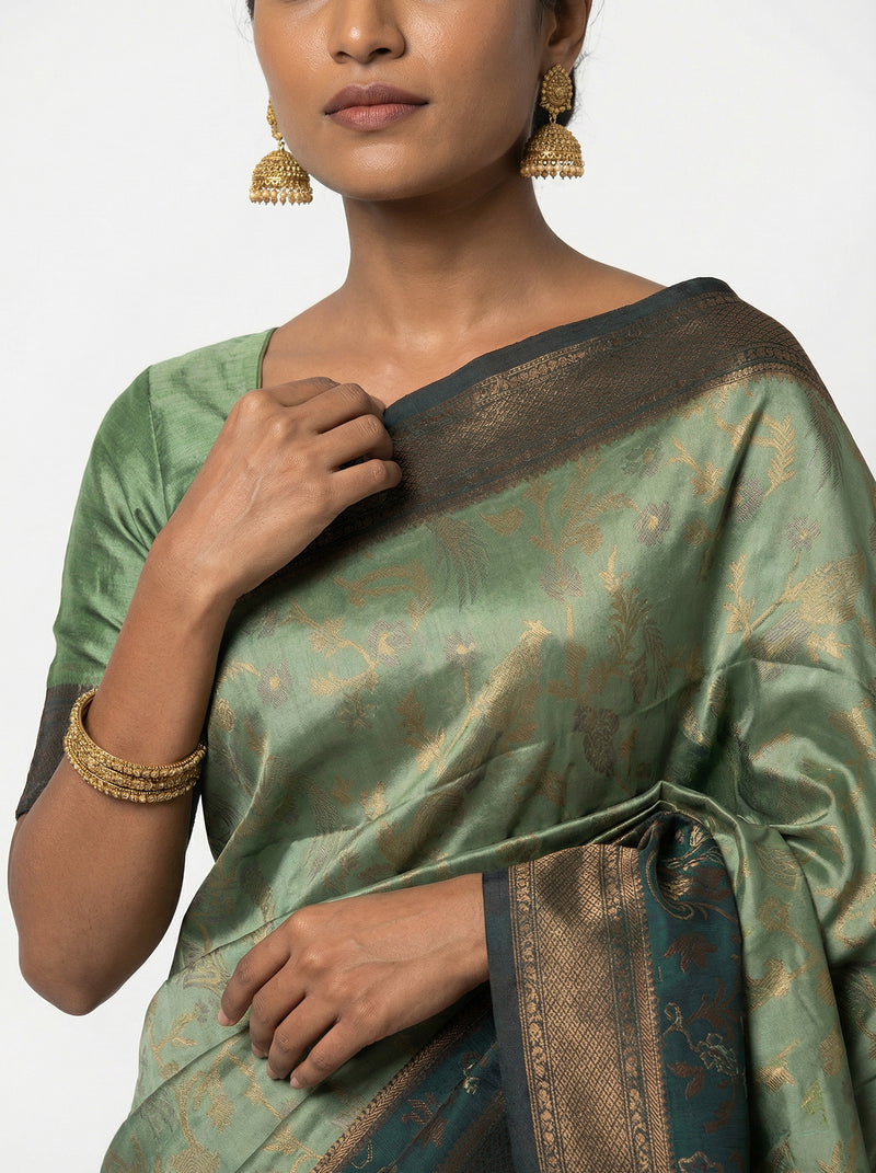 Semi Silk Saree with Floral Border and Bottle Green Golden Butta Blouse Piece
