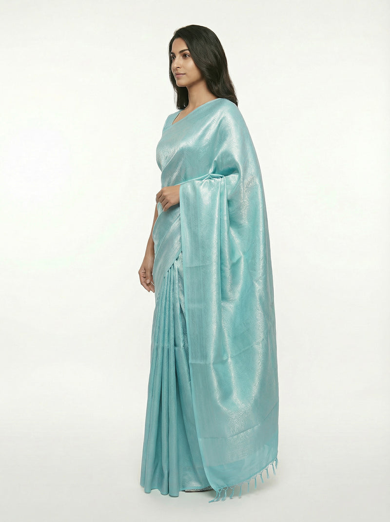 Elevate your ethnic wardrobe with this stunning semi-silk saree in a serene sea foam hue. Crafted with meticulous jacquard detailing, this piece seamlessly blends traditional elegance with contemporary sophistication. The luxurious semi-silk fabric drapes beautifully, offering comfort and a refined sheen perfect for festive occasions, celebrations, or special gatherings. The intricate jacquard work showcases skilled craftsmanship, making it a versatile choice for those who appreciate timeless Indian textiles. An ideal addition for anyone seeking authentic style with modern appeal.