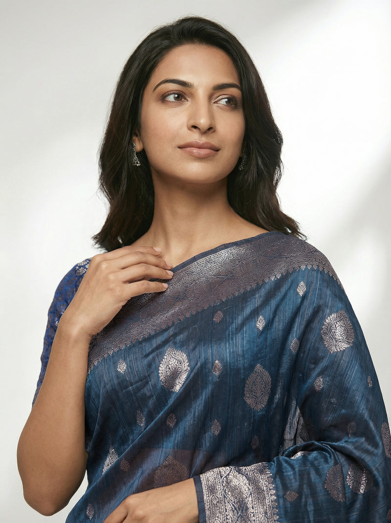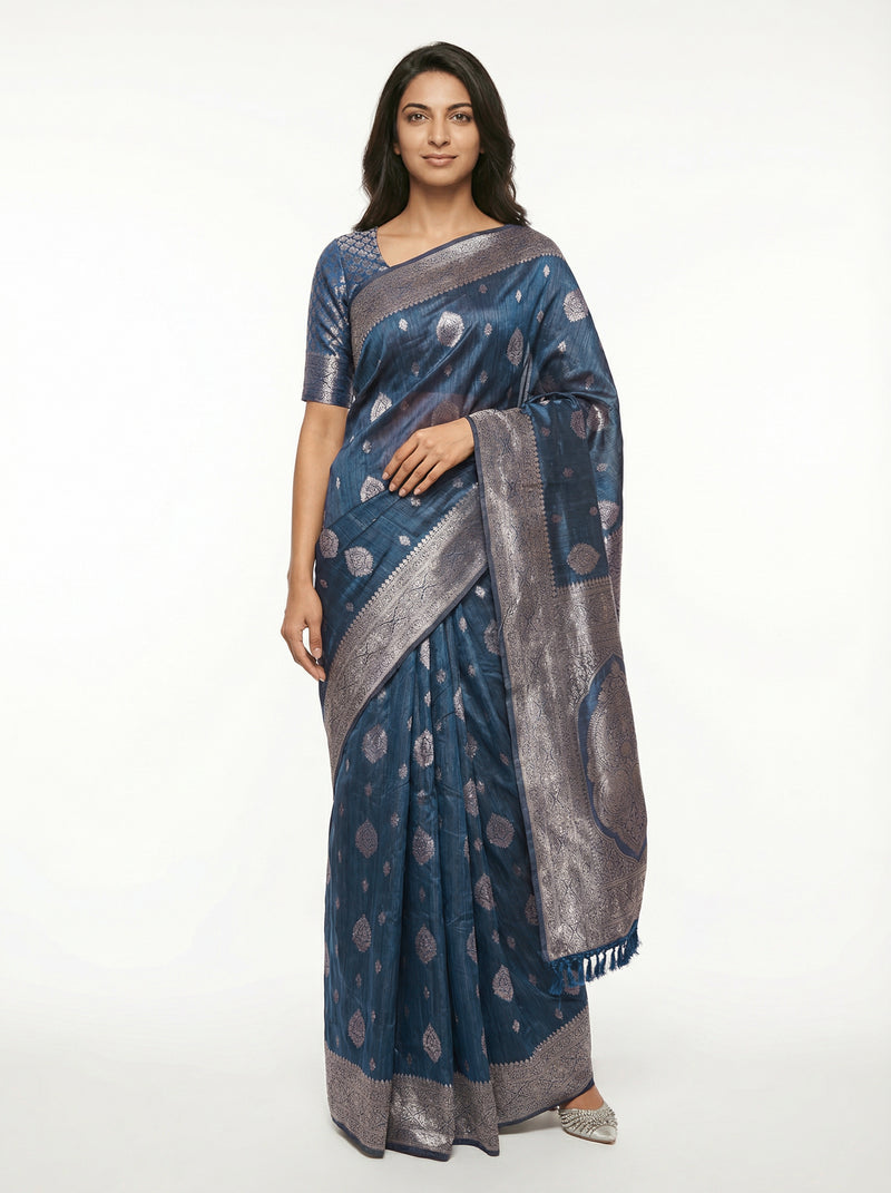 This exquisite peacock blue saree combines traditional artistry with contemporary elegance. Crafted from premium semi-silk, it features an ornate Banarasi border embellished with intricate buttas that reflect authentic Indian weaving heritage. The deep, jewel-toned blue creates a striking presence while remaining versatile for various complexions. The fabric's natural drape enhances your silhouette with effortless grace. Perfect for weddings, festivals, and formal celebrations, this saree is a timeless investment piece. Style it with statement earrings and a bindi to honor its cultural roots and showcase your refined taste.