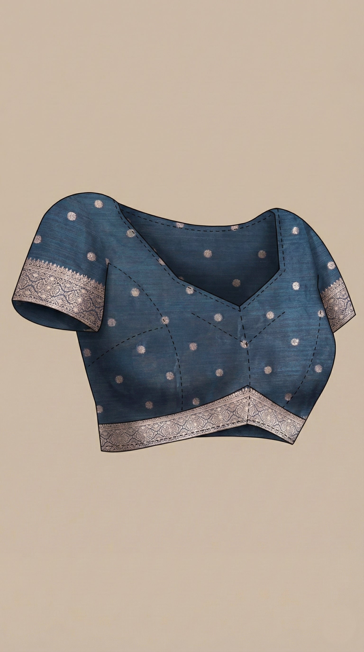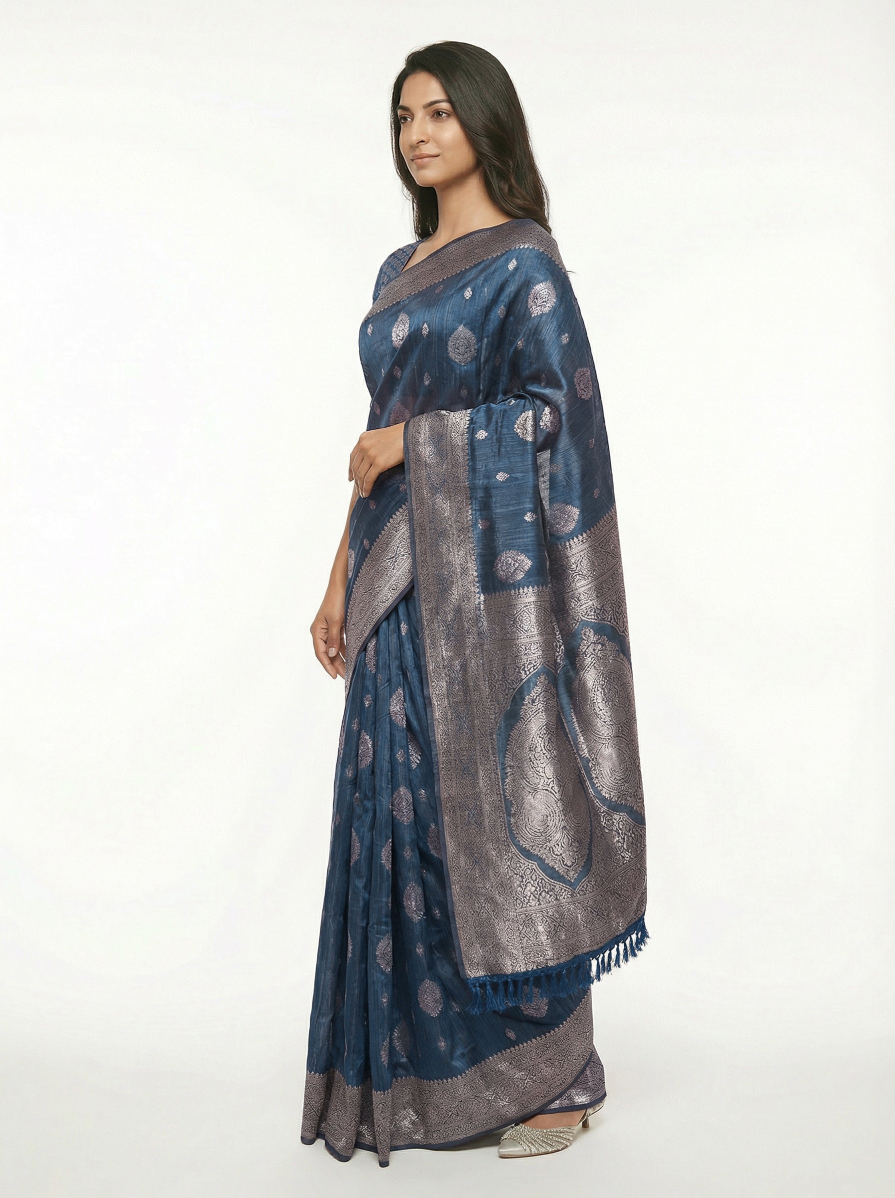 Semi Silk Traditional Peacock Blue Saree with Banarasi Border & Buttas