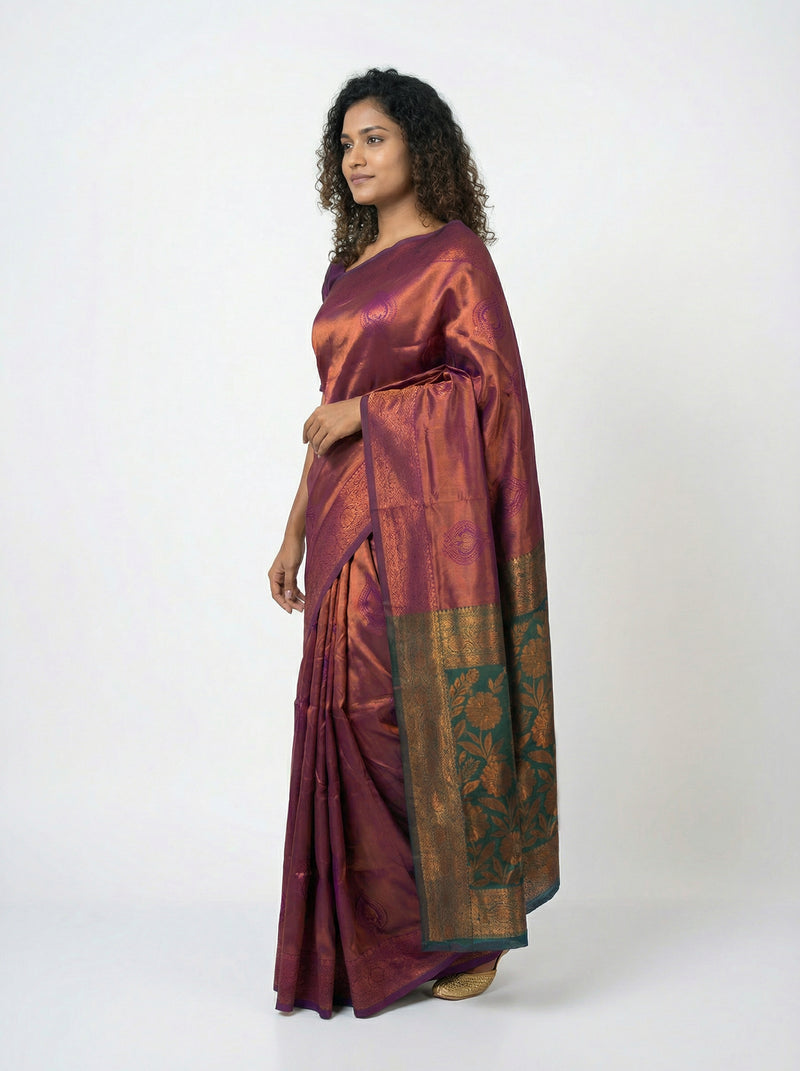 Semi Silk Women’s Grape Saree with Designer Floral Pattern & Green Blouse
