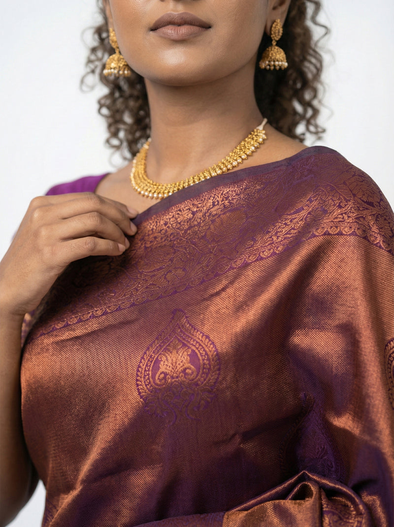 Experience refined elegance with this exquisite semi-silk saree in deep grape, featuring an ornate designer floral motif that captures attention. Crafted from premium semi-silk fabric, it offers a graceful drape with exceptional comfort, making it ideal for extended wear during celebrations. The ensemble includes a complementary green blouse that perfectly balances the rich grape tone. Whether you're attending weddings, festivals, or cultural events, this saree seamlessly blends traditional artistry with contemporary style. The intricate embellishments and thoughtful color palette create a statement piece that honors heritage while embracing modern sophistication.