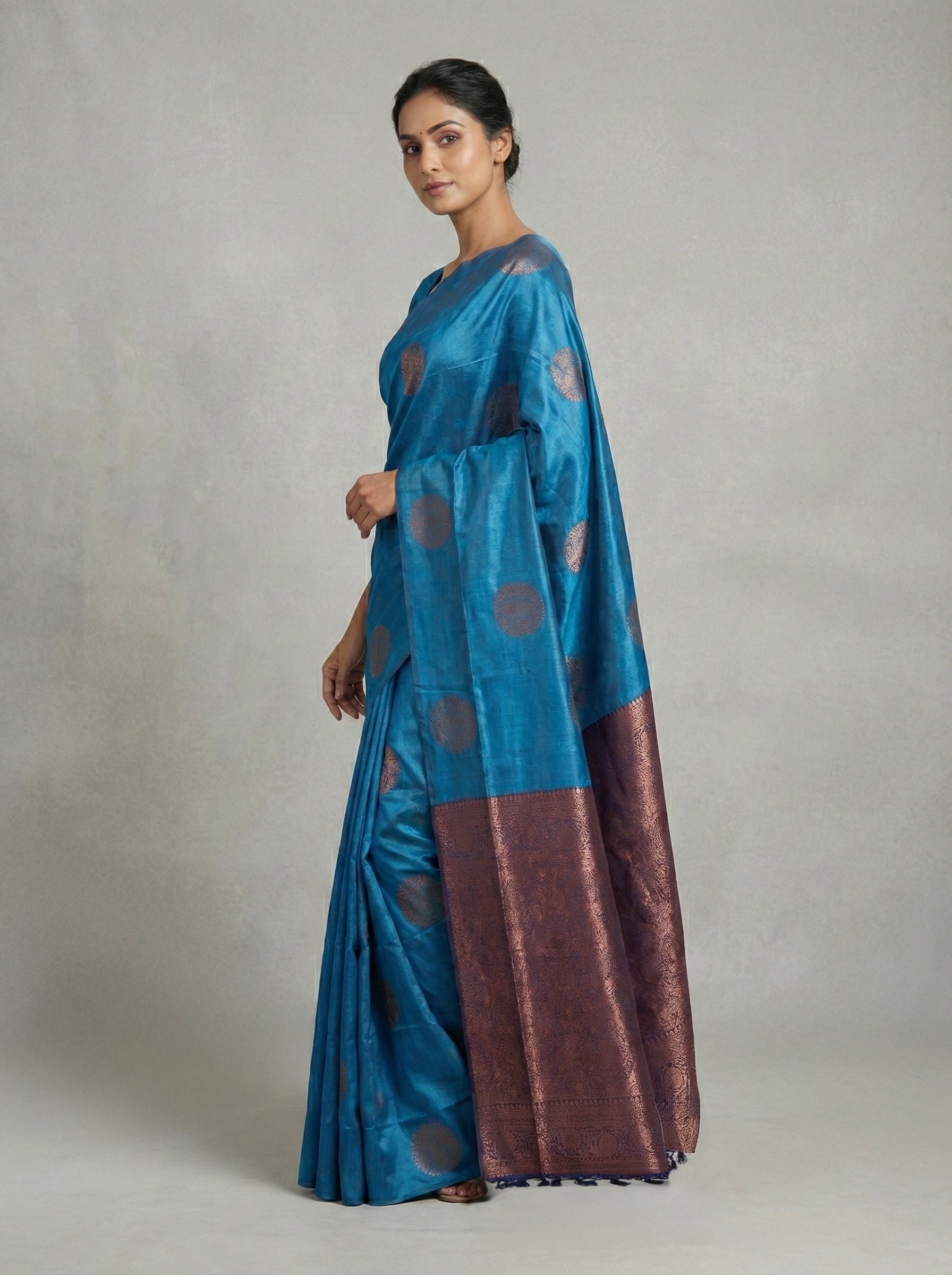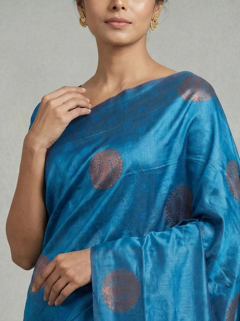 Embrace timeless elegance with this semi-silk saree in captivating peacock blue. The luxurious fabric drapes gracefully while offering everyday comfort, making it perfect for festivals and celebrations. Paired with a contrasting navy blue blouse, this ensemble delivers sophisticated style through its harmonious color palette. The semi-silk composition ensures durability and a refined finish, while the classic design transcends seasonal trends. Ideal for those seeking quality craftsmanship and understated luxury in their traditional wardrobe.