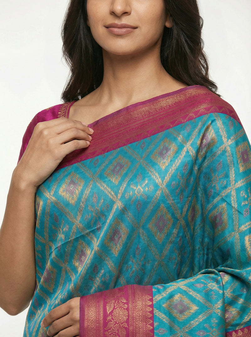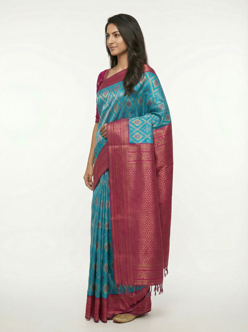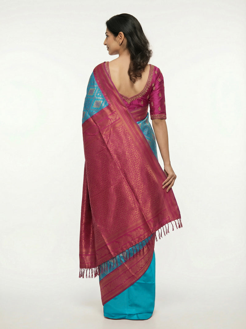 Semi Silk Women’s Peacock Blue Saree with Contrast Wine Blouse
