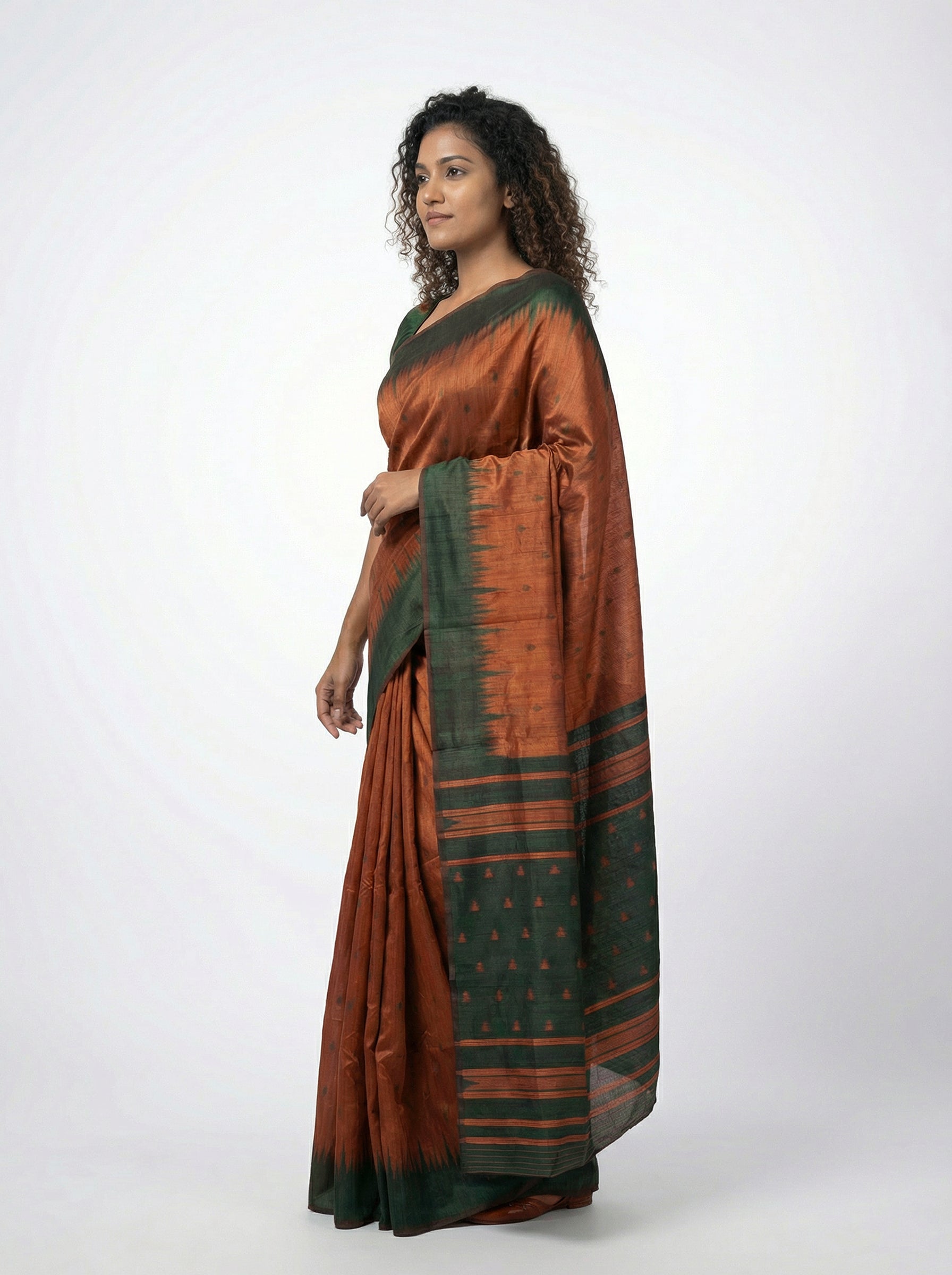 Experience the perfect blend of tradition and style with this exquisite semi-silk saree featuring a warm wood brown palette paired with a striking bottle green blouse. Crafted from premium semi-silk fabric, this ensemble offers a soft, flowing drape that flatters every silhouette while maintaining its shape throughout the day. The earthy brown base provides a sophisticated foundation, while the vibrant green blouse adds a modern twist to classic saree styling. Whether you're attending weddings, festivals, or cultural celebrations, this versatile piece transitions seamlessly from day to evening wear. A must-have for those seeking refined elegance with a contemporary edge.