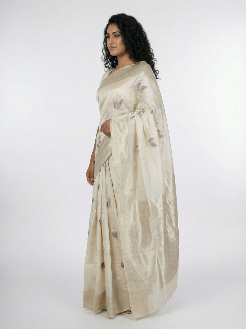 Semi SilkOff White Ethnic Saree with Traditional Pallu & Leaf Weave