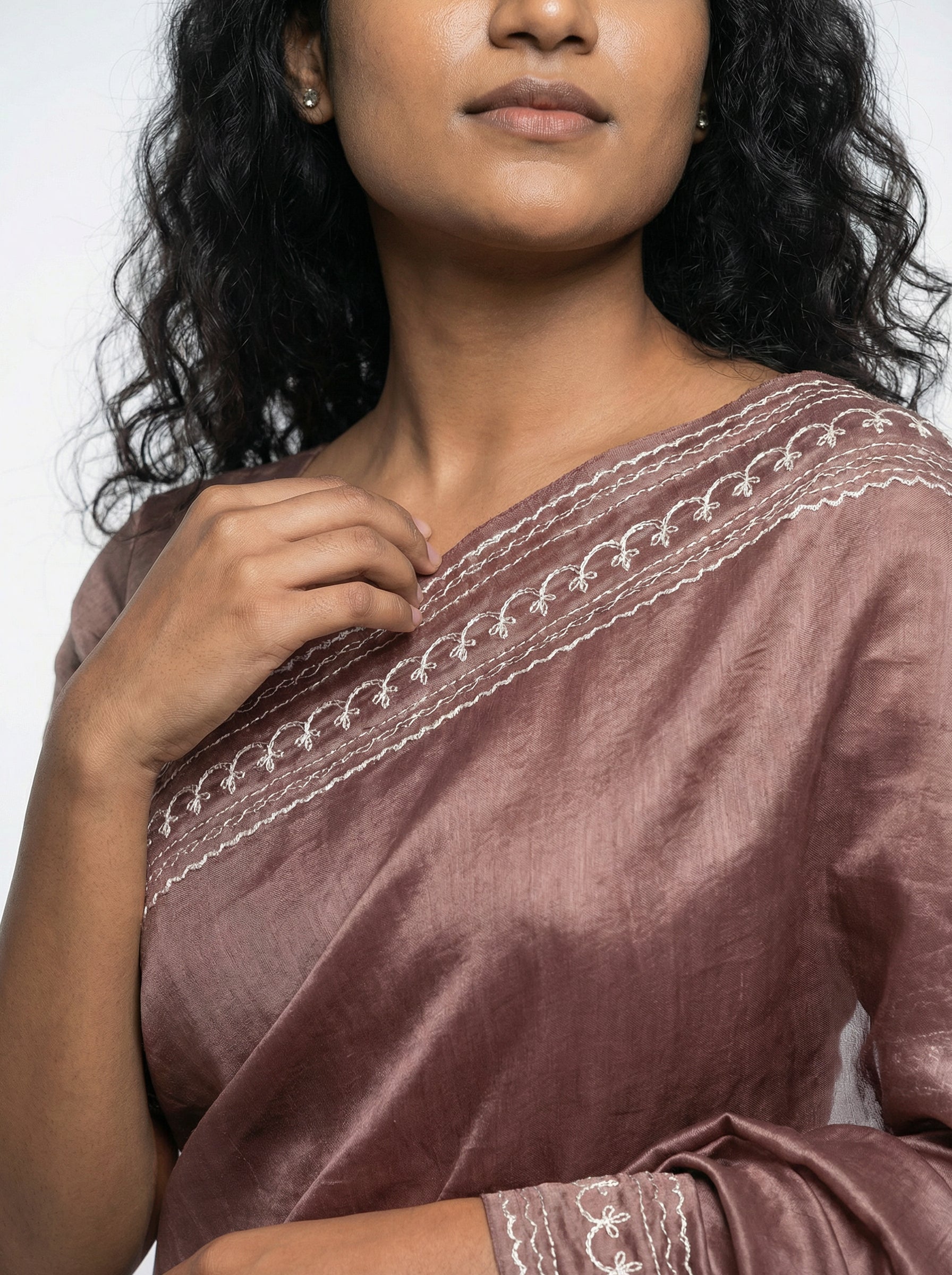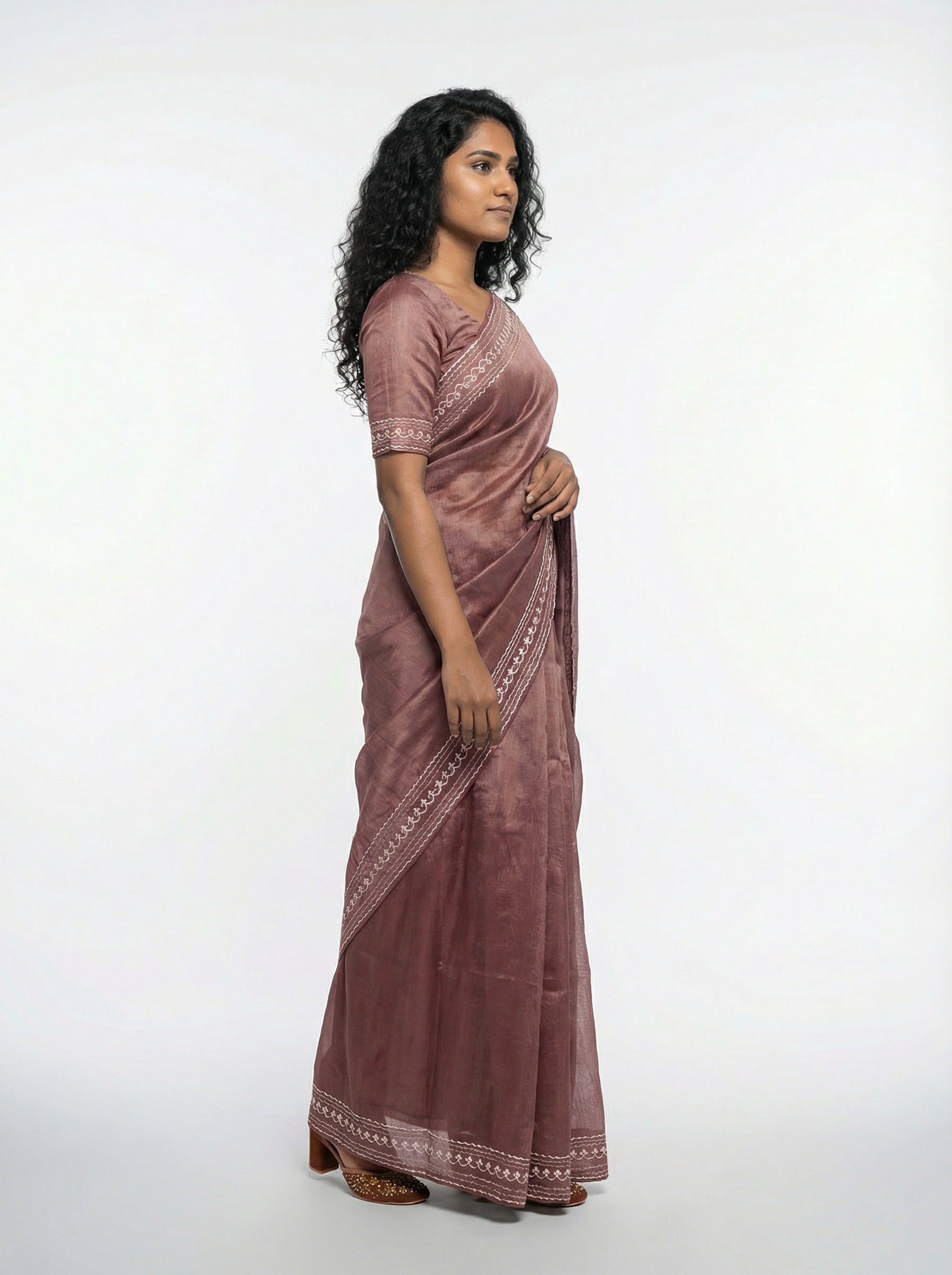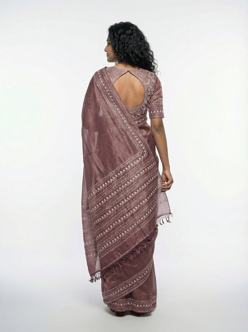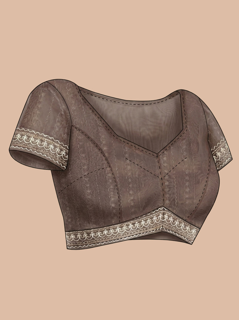 Shimmer Organza Brown Saree with Plain Border Blouse