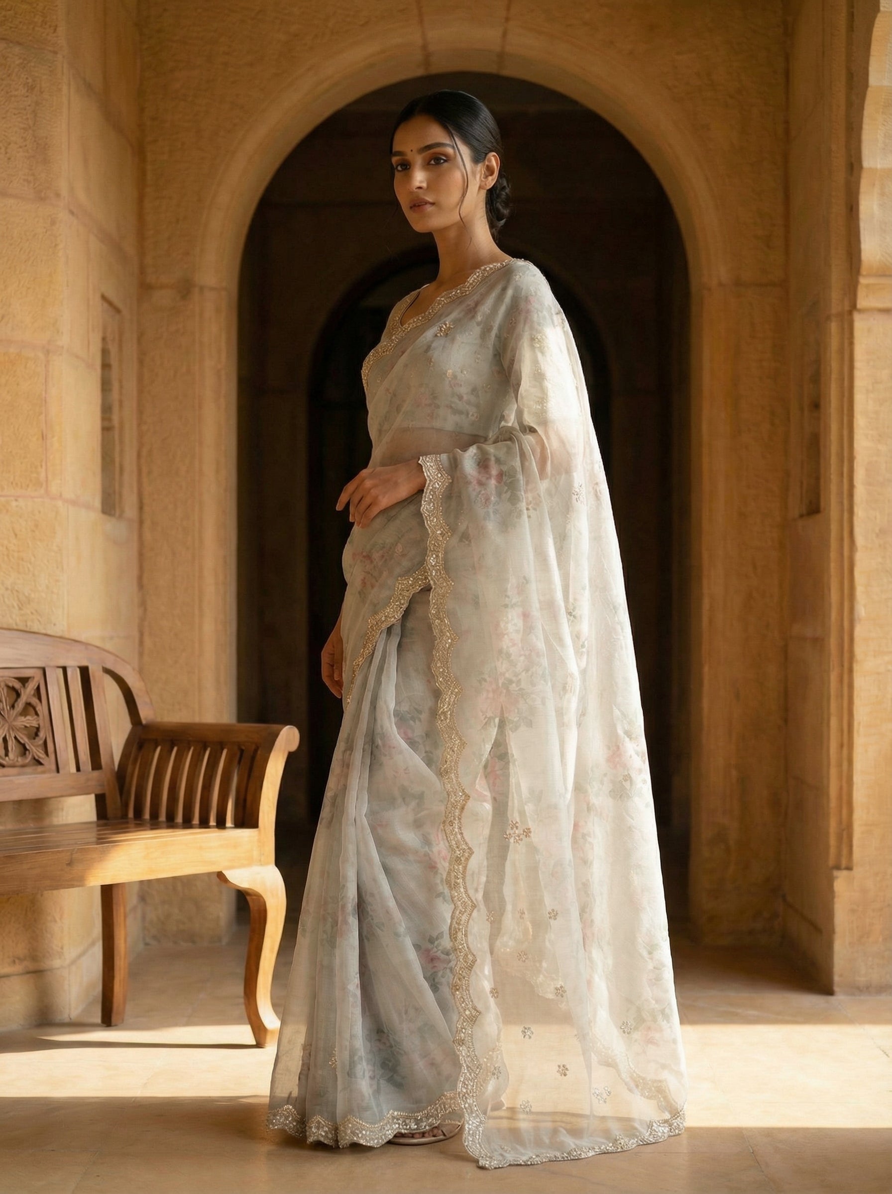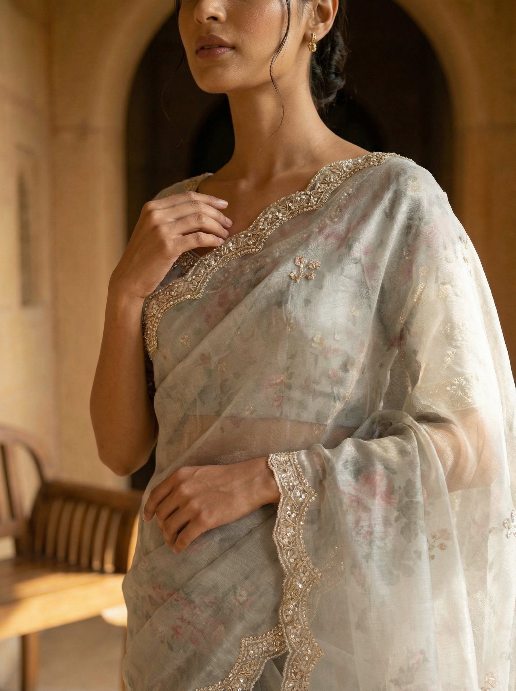 The sheer organza fabric enhances the light, graceful drape, while the saree is finished with an exquisite scalloped border, highlighted with fine golden thread embroidery and bead edging. The pallu continues the same floral-printed pattern with matching thread-worked buttas for a cohesive, elegant finish.