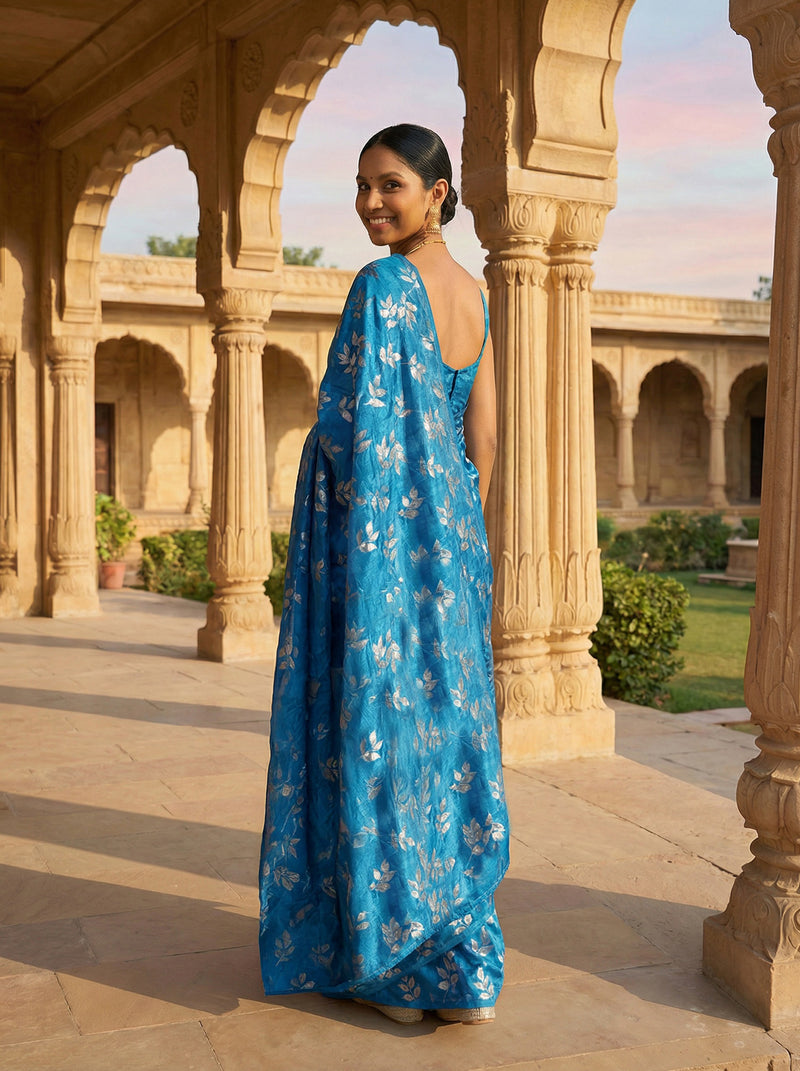 Synthetic Blue Saree with Nature-Inspired Botanical Design