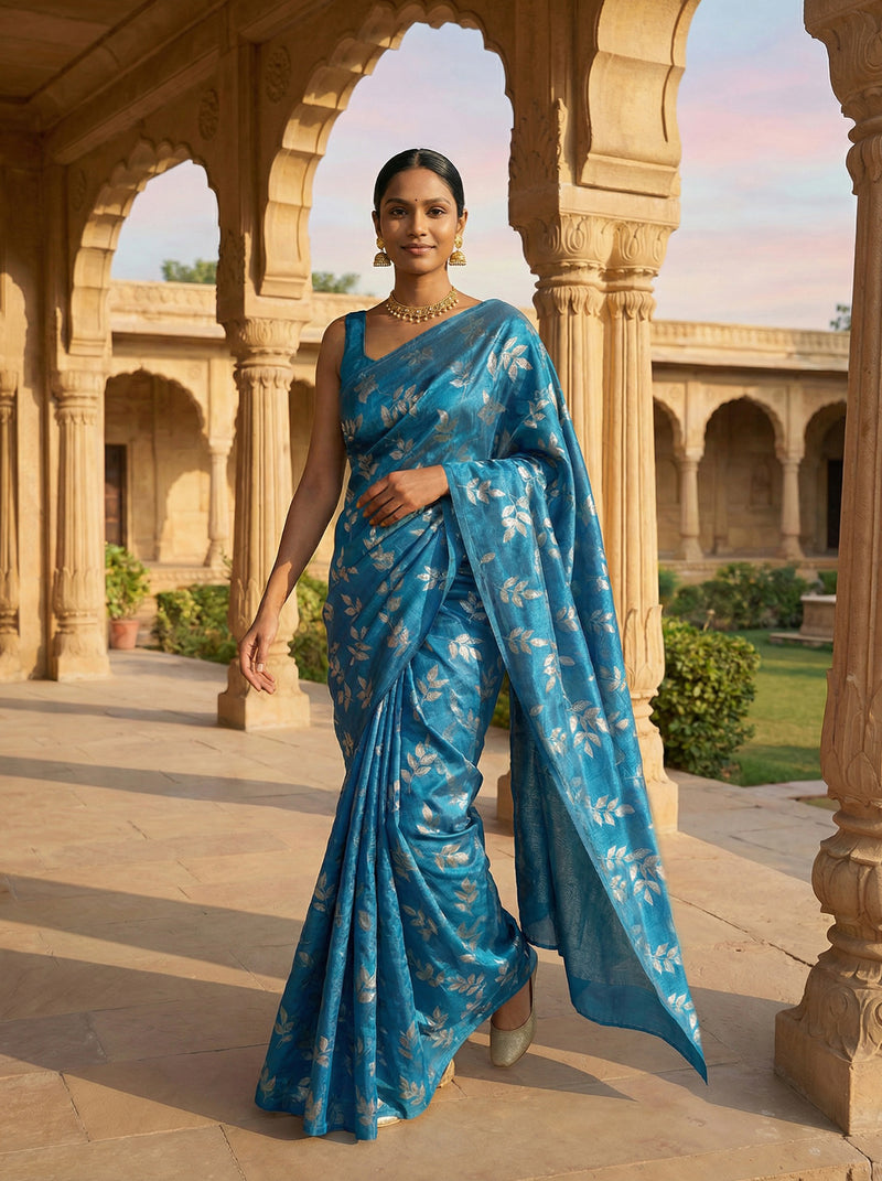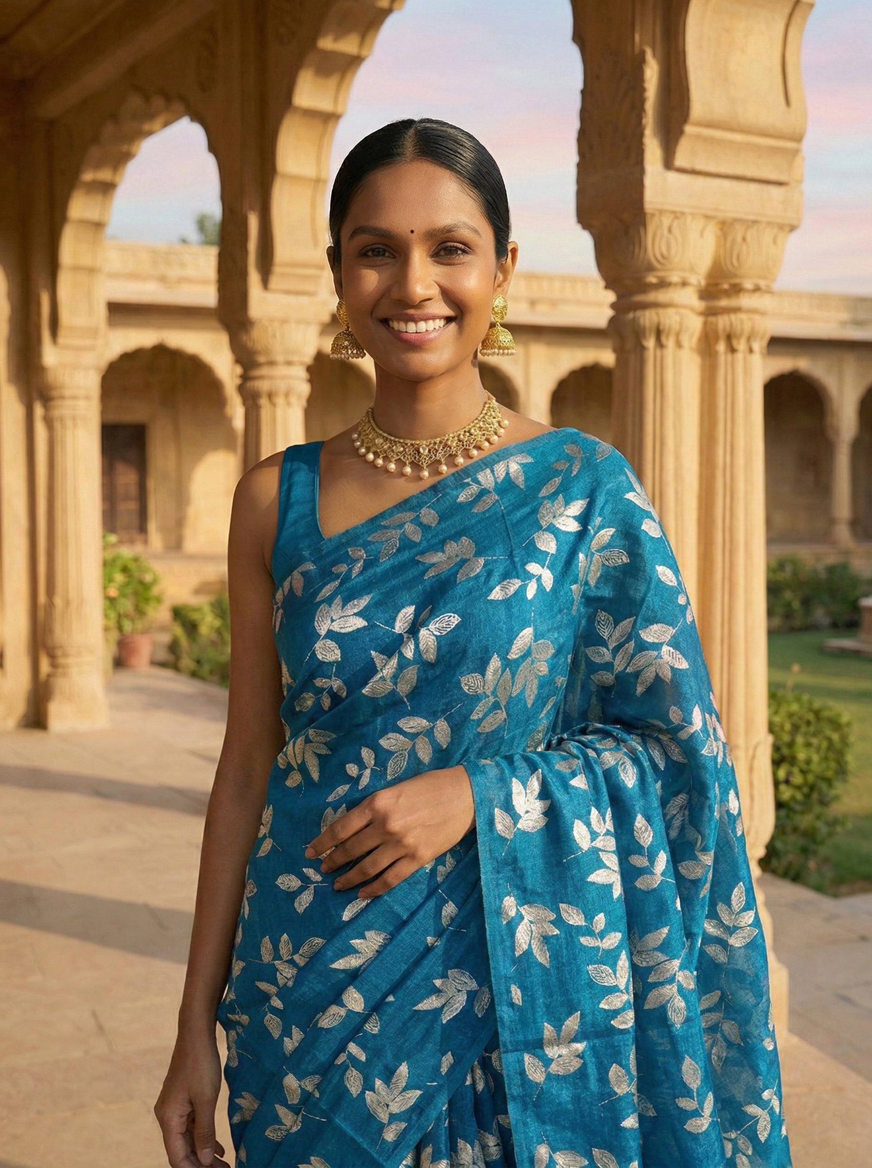 Elevate your ethnic wardrobe with this stunning synthetic blue saree, featuring an intricate nature-inspired botanical design. The rich blue fabric drapes beautifully, while delicate floral motifs add sophistication and charm. Perfect for festive occasions, celebrations, or everyday elegance, this saree combines comfort with timeless style. The synthetic material ensures easy care and durability, making it an ideal choice for modern wear. Pair with traditional jewelry and accessories to complete your look.