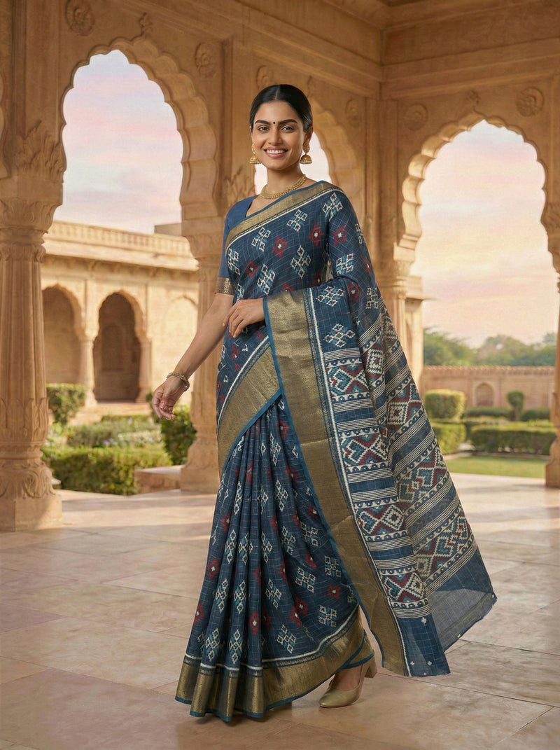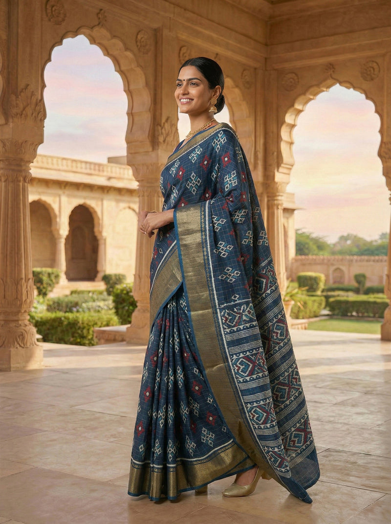 Synthetic Navy Blue Saree with Traditional Motif Design