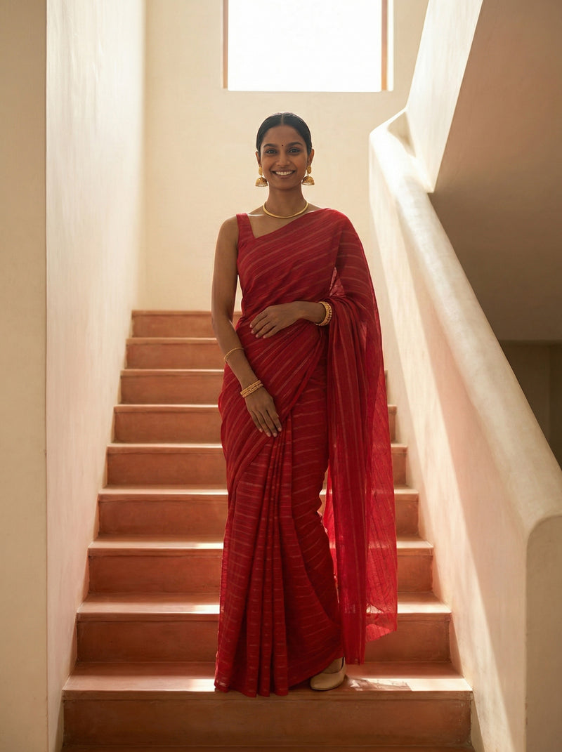 Synthetic Bright Red Saree with Elegant Stripe Pattern