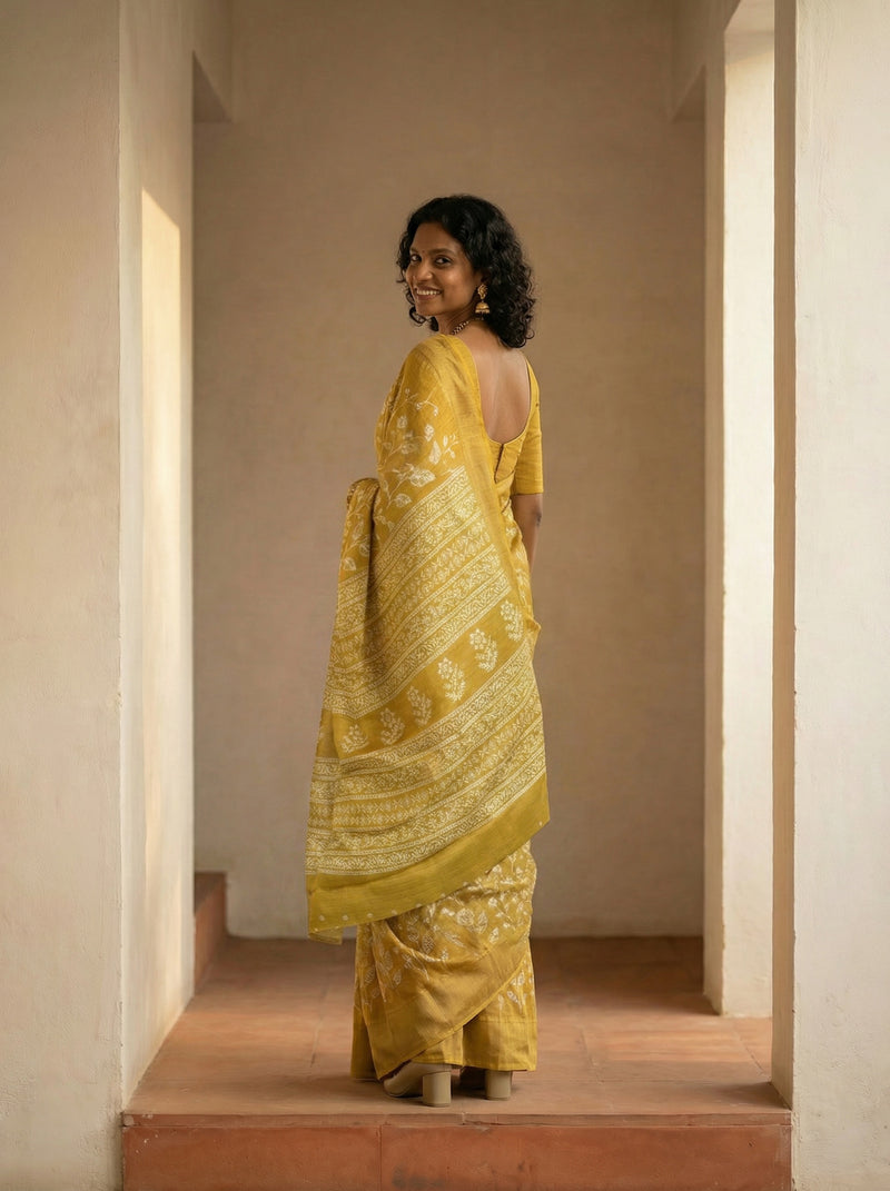 Synthetic Bright Yellow Saree with Floral Pattern