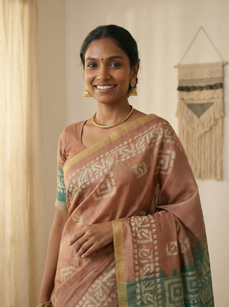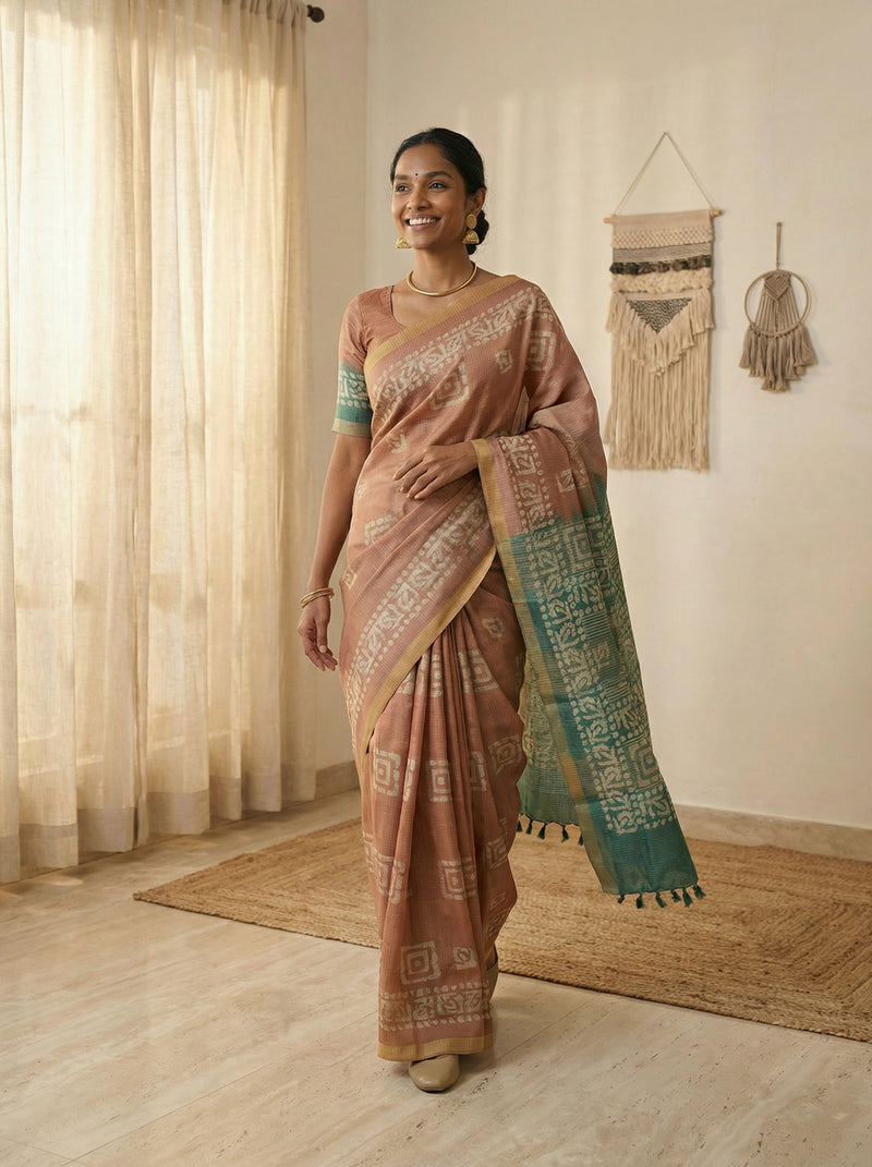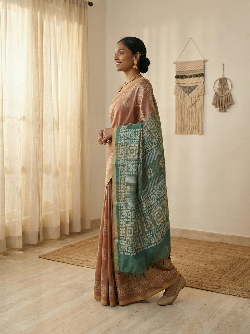 Elevate your ethnic wardrobe with this striking synthetic brown saree, adorned with intricate geometric butta patterns that add contemporary flair to a timeless silhouette. The rich brown hue complements all skin tones, while the geometric design offers a modern twist on traditional saree aesthetics. Crafted from durable synthetic fabric, this saree is easy to maintain and perfect for festive occasions, celebrations, or everyday elegance. Drape with confidence and make a statement with this versatile piece that seamlessly blends classic charm with modern design sensibilities.