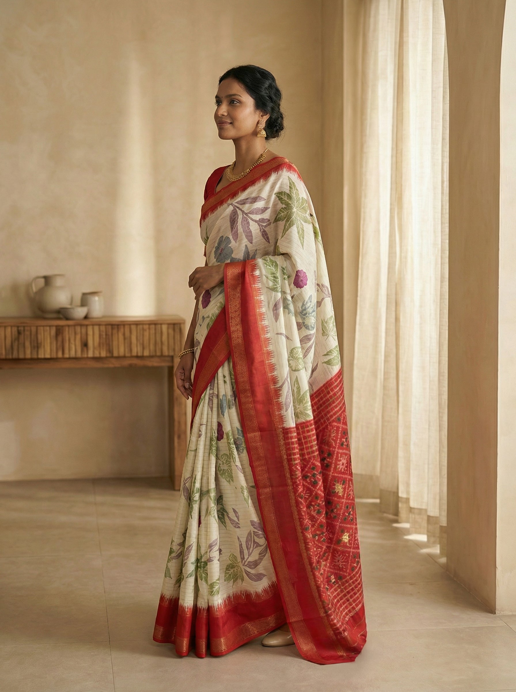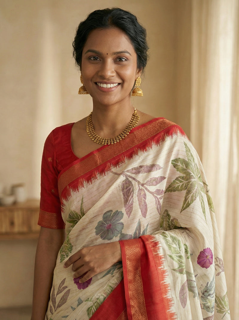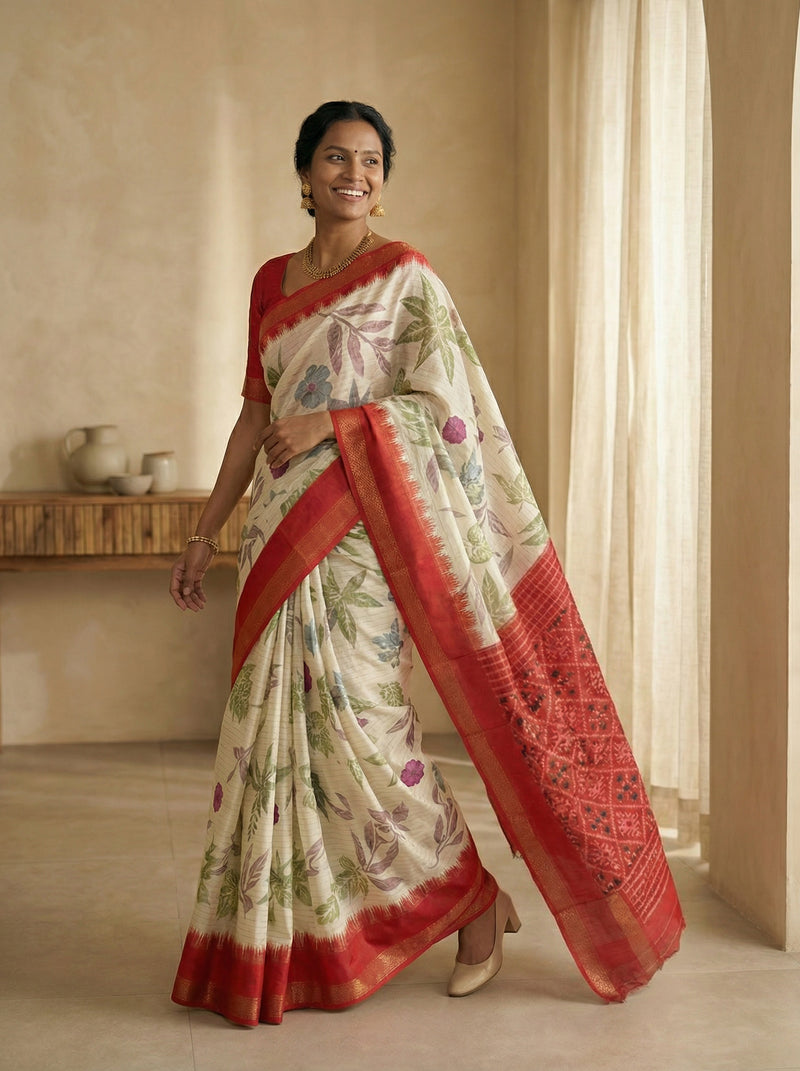 Synthetic Cream Floral Print Saree with Elegant Red Border