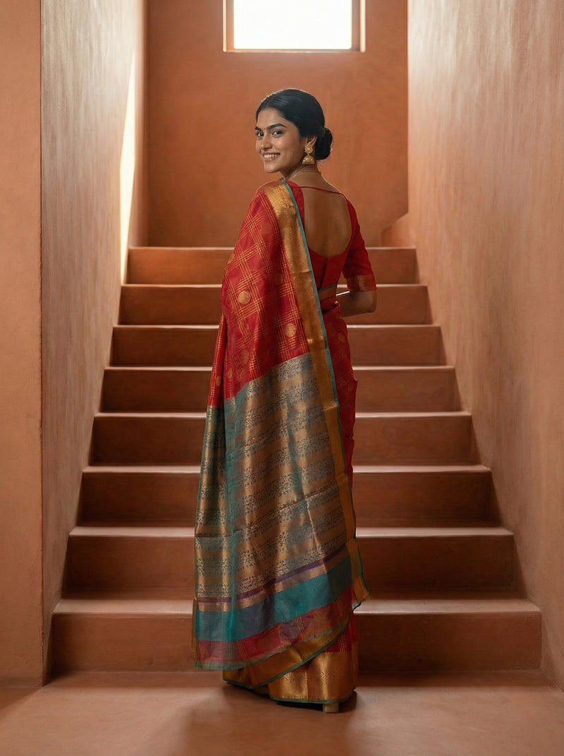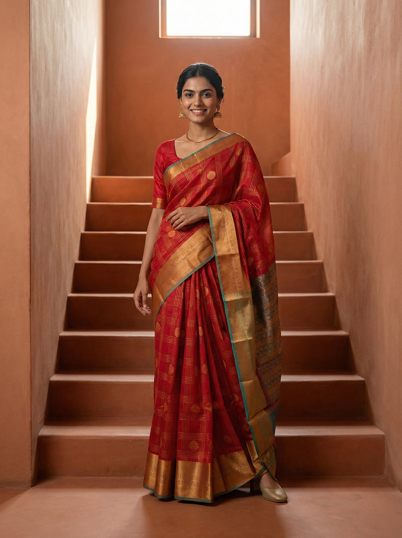 Synthetic Red Elegant Saree with Check Pattern and Zari Pallu