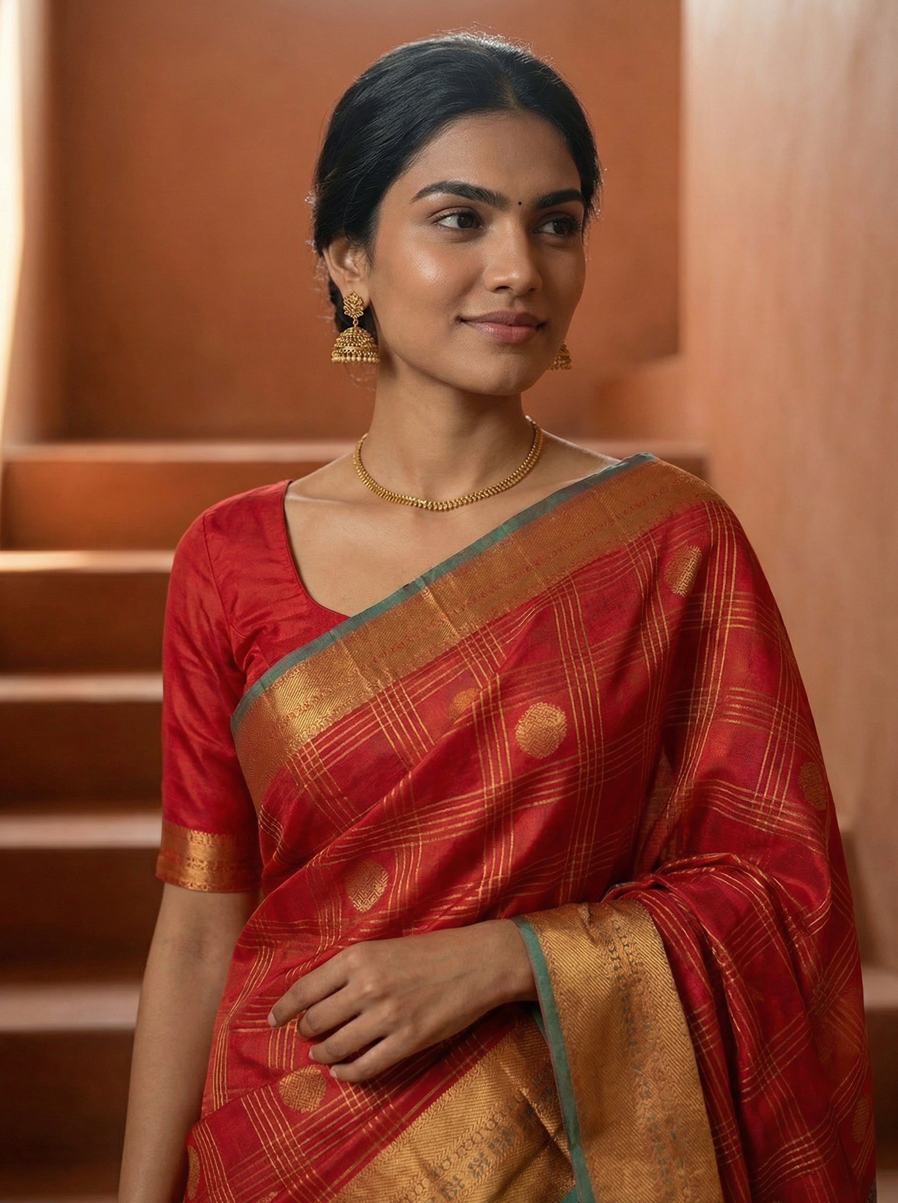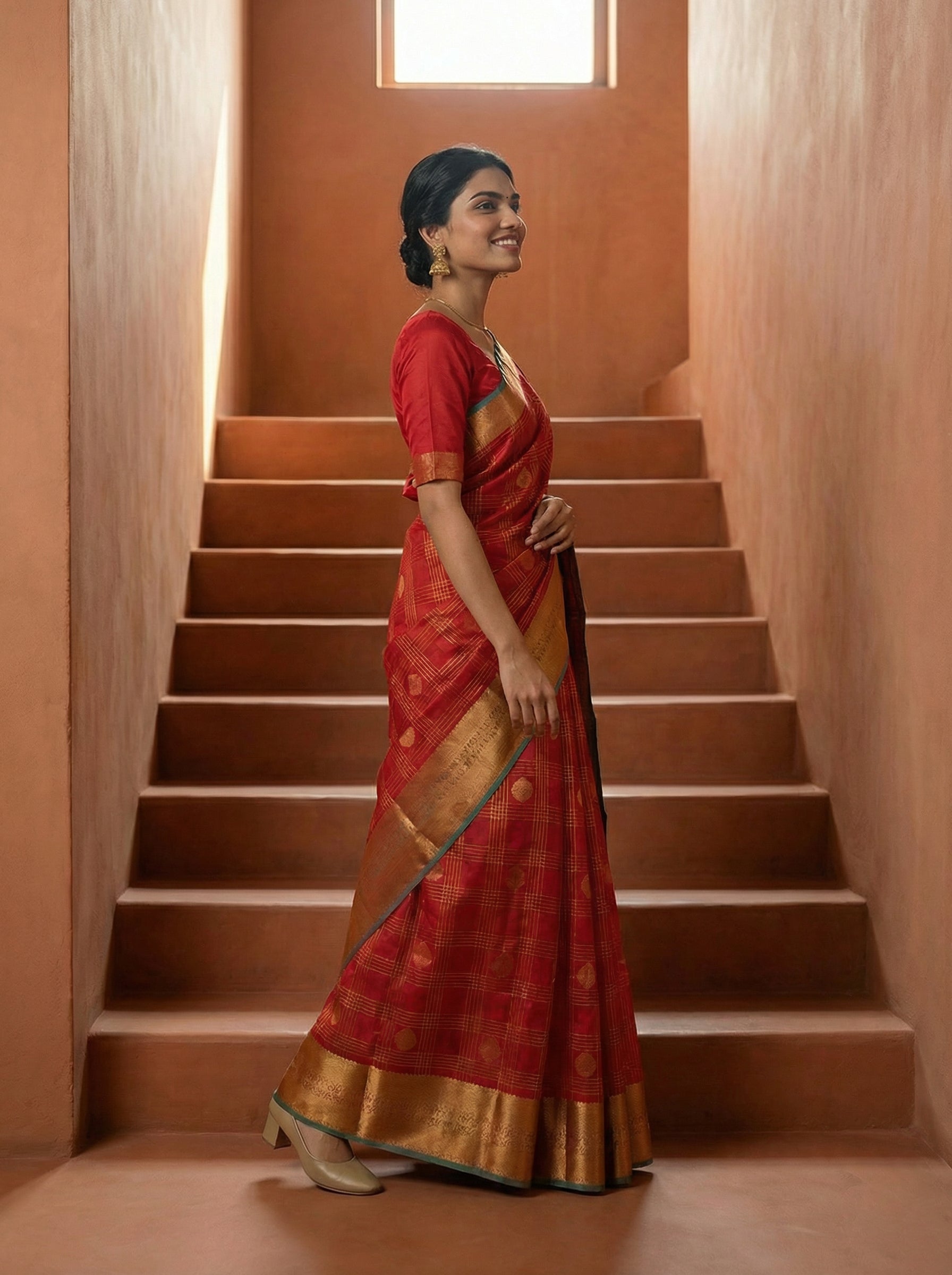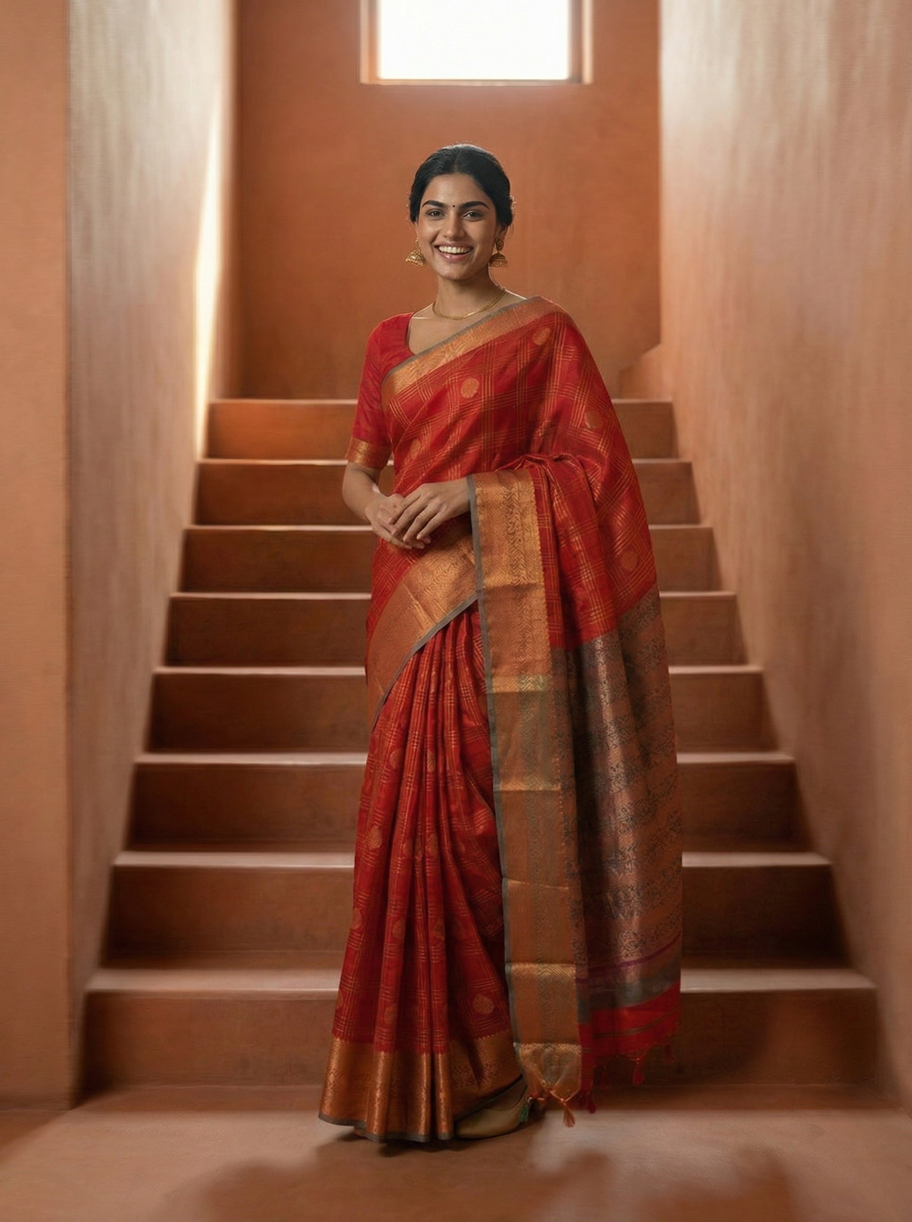Elevate your ethnic wardrobe with this stunning synthetic red saree, featuring a sophisticated check pattern throughout and an ornate zari pallu that adds timeless elegance. The lightweight synthetic fabric ensures comfort and easy maintenance, making it perfect for festive occasions, celebrations, and traditional events. The intricate zari embellishment on the pallu creates a striking focal point, while the check design adds contemporary flair to classic saree styling. Ideal for those seeking a versatile piece that balances tradition with modern sensibility.