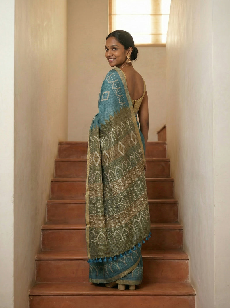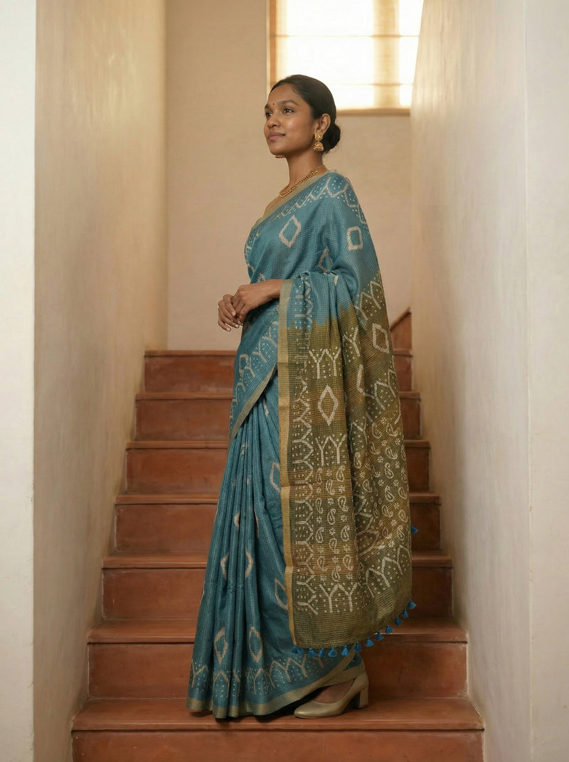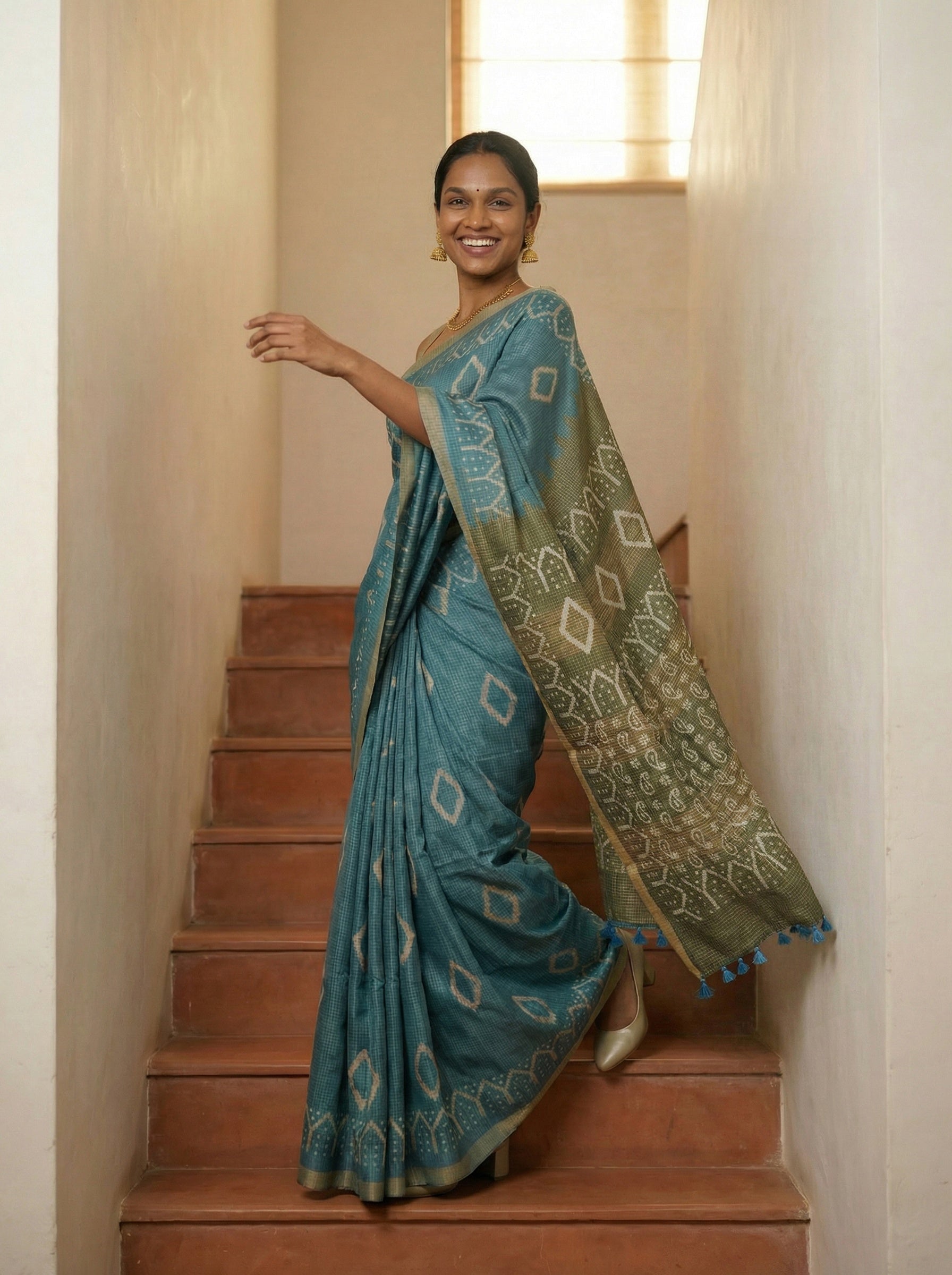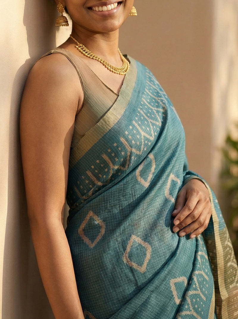 Synthetic Teal Blue Saree with Geometric Butta Design