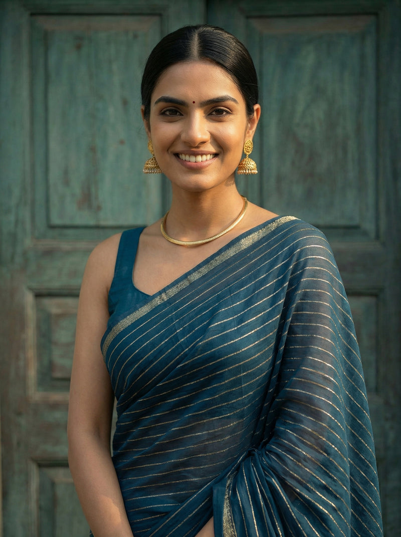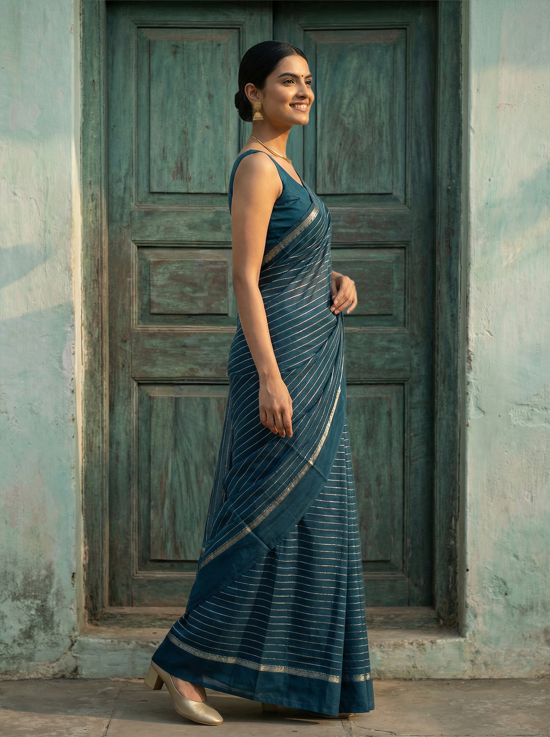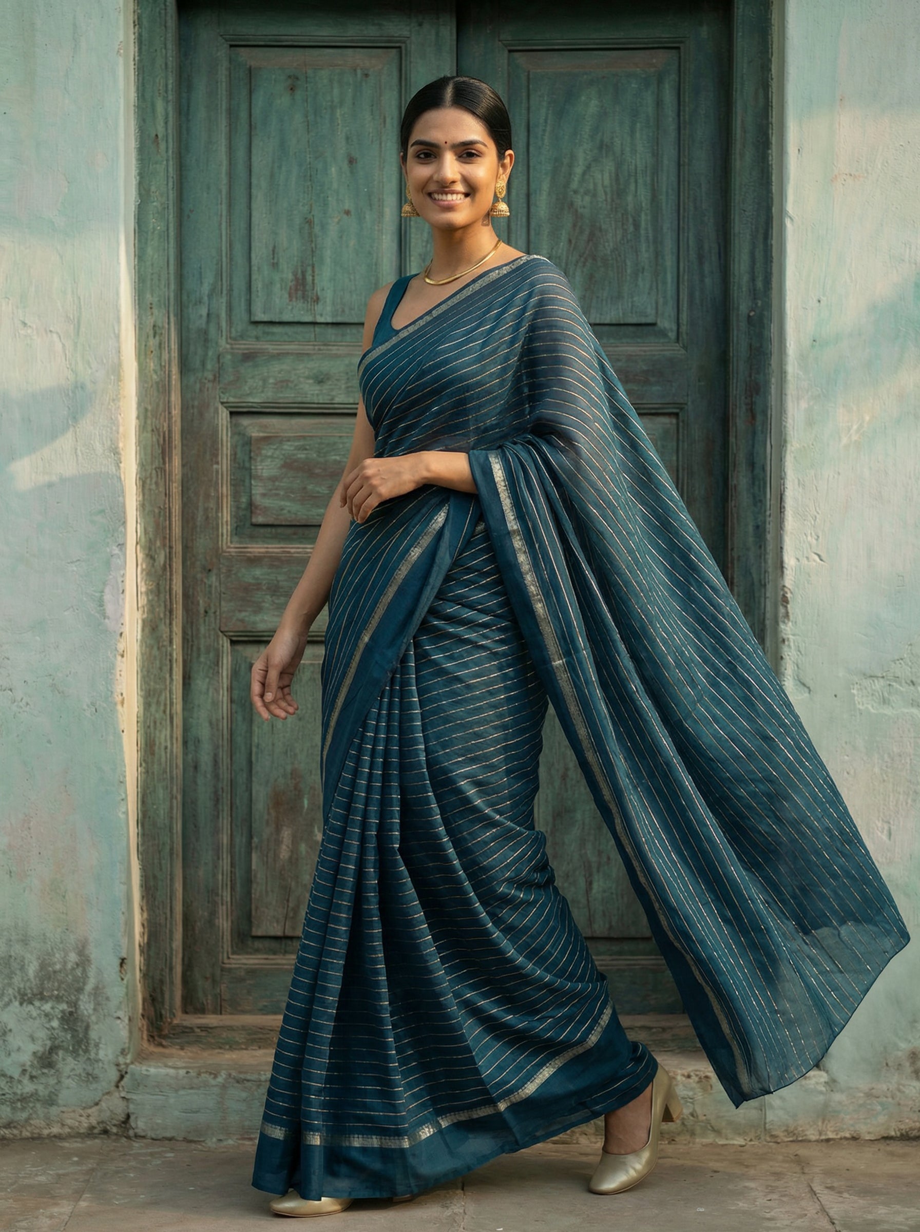 Elevate your ethnic wardrobe with this stunning synthetic teal green saree, featuring timeless gold stripes that add sophistication and elegance. The rich teal hue complements all skin tones, while the classic gold detailing creates a refined, festive look perfect for celebrations, weddings, and special occasions. Crafted from high-quality synthetic fabric, this saree offers easy maintenance and durability without compromising on style. The traditional drape pairs beautifully with statement jewelry and classic accessories. Ideal for those seeking a versatile, eye-catching piece that transitions seamlessly from daytime events to evening gatherings.