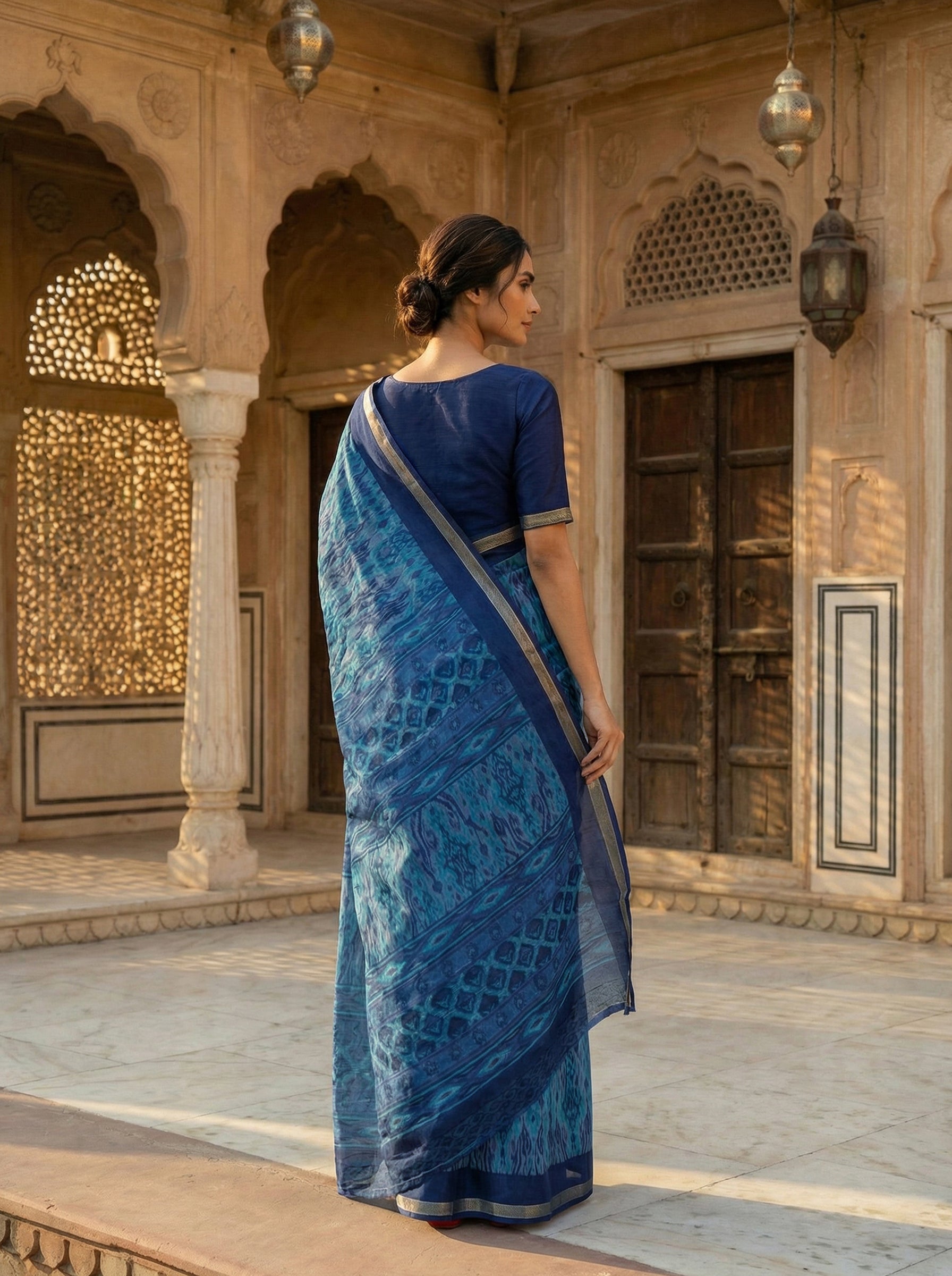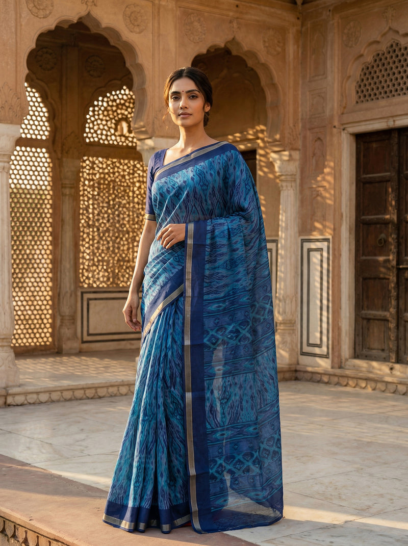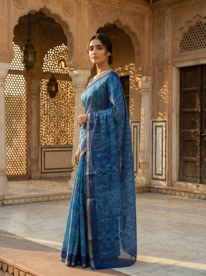 Teal Blue Ikat-Inspired Printed Saree with Zari Border