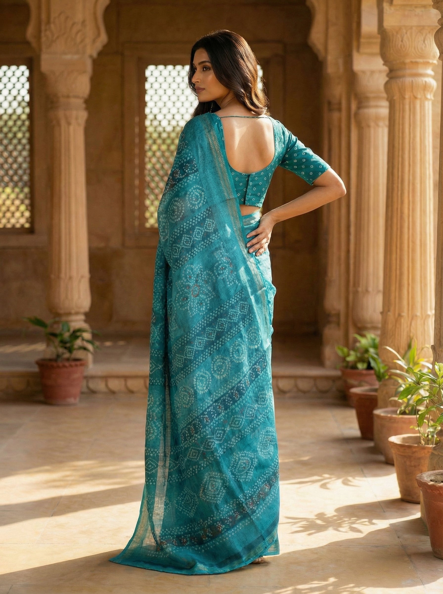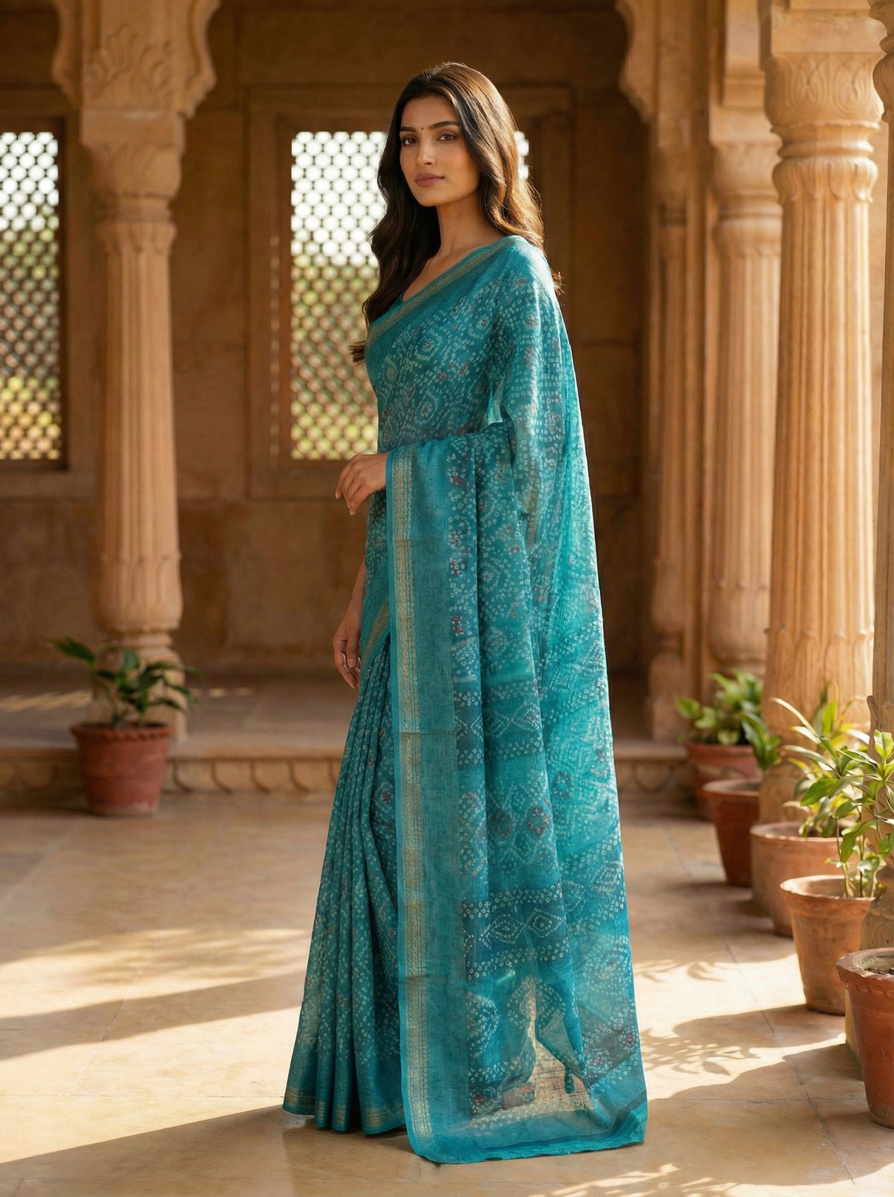 This graceful teal green saree features a traditional bandhani-inspired print arranged in elegant diagonal and geometric patterns across the body. Crafted from a lightweight and breathable fabric, the saree offers a soft drape and all-day comfort. The subtle zari detailing along the border adds a refined touch without overpowering the overall look.