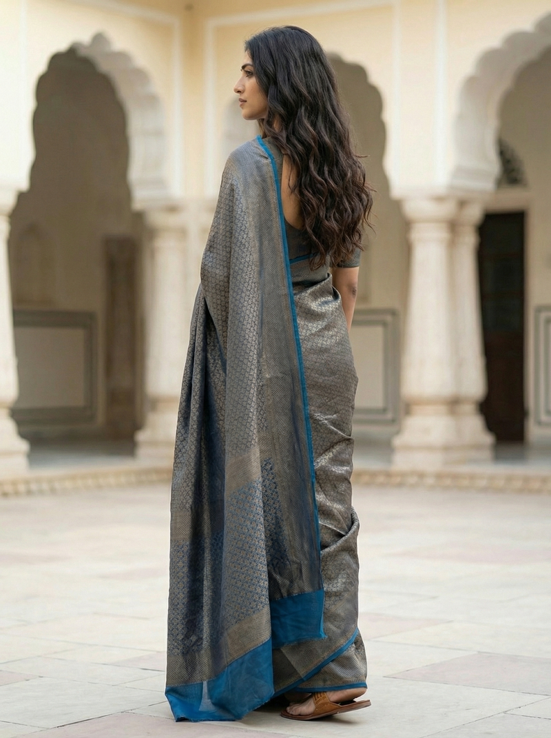 Tusser Silk Blue Gold Zari Weave Saree