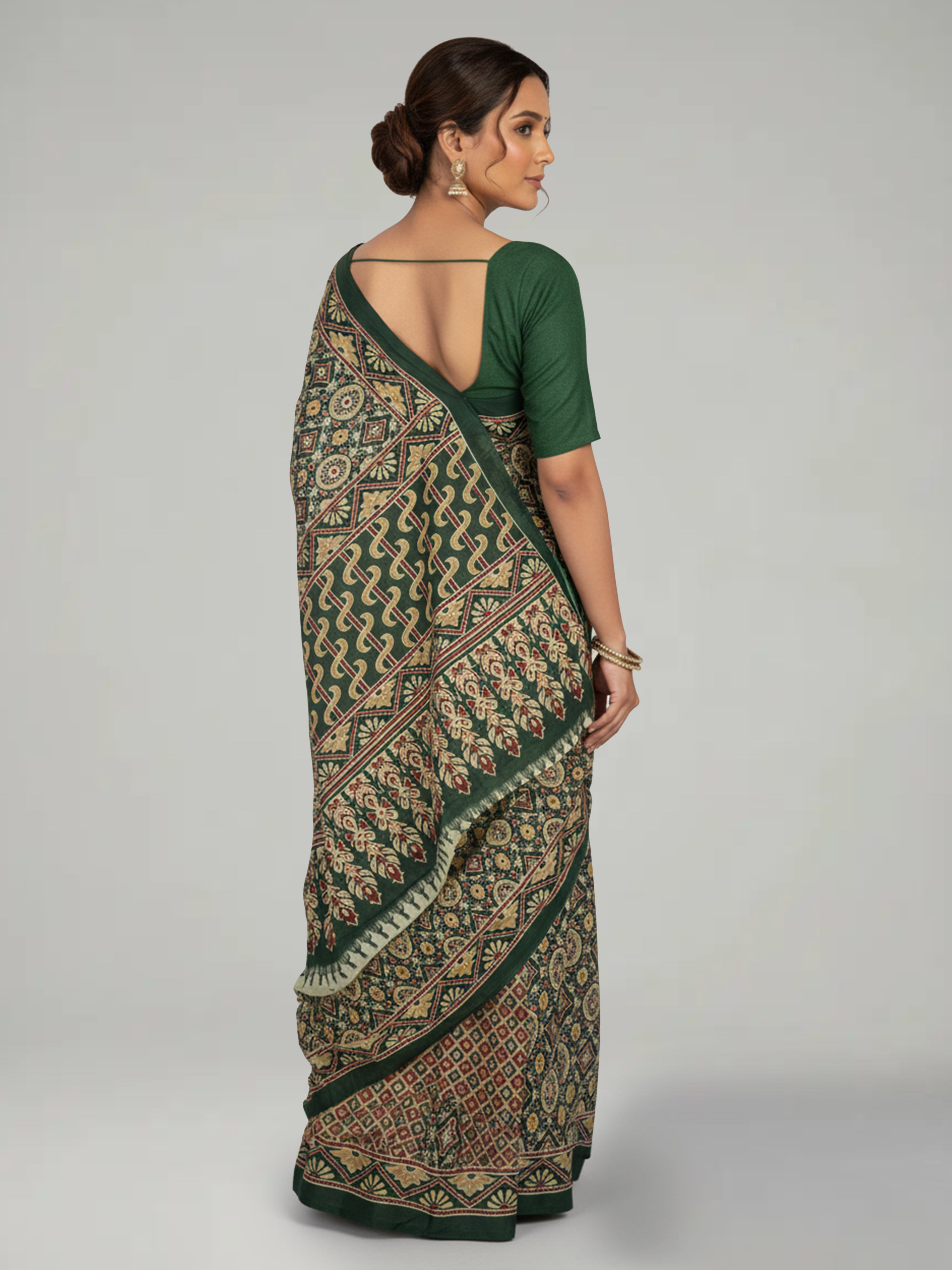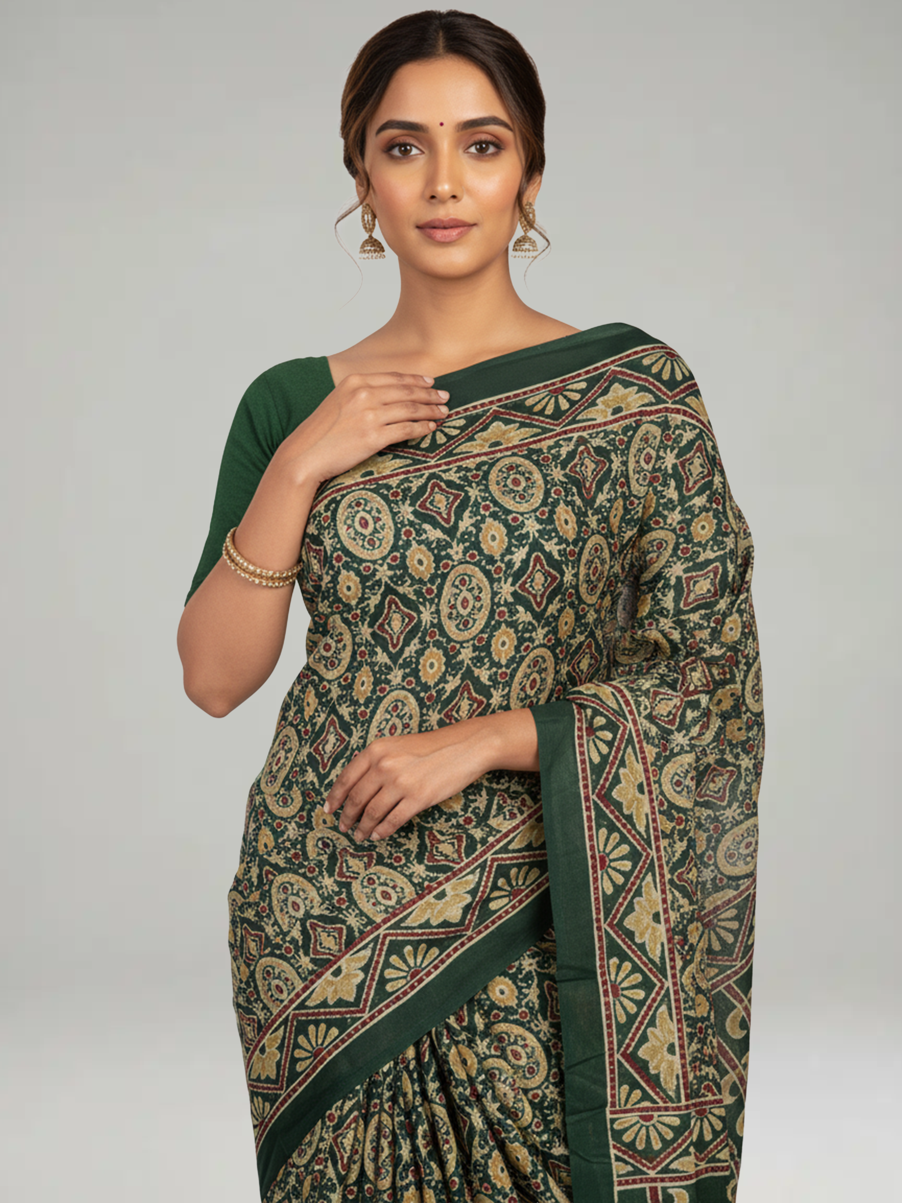 Verdant Green Soft Cotton Saree With Ajrakh Print