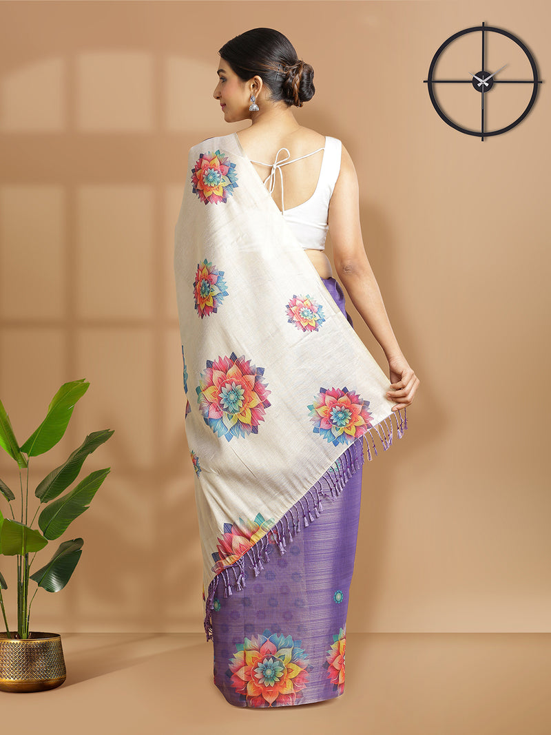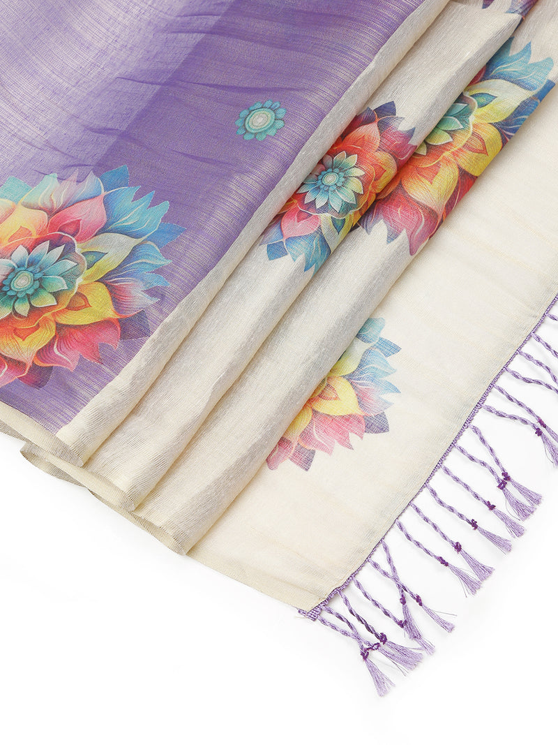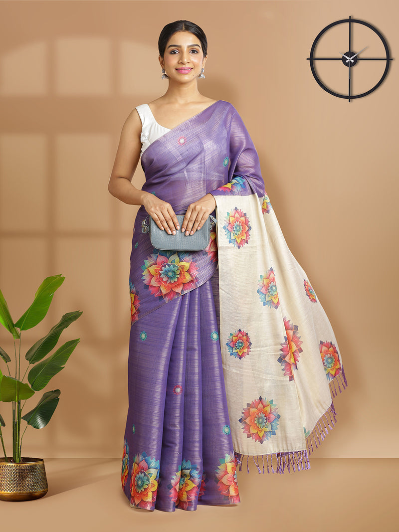 Violet Color Tissue Saree And Golden Pallu With Floral Design Over Body