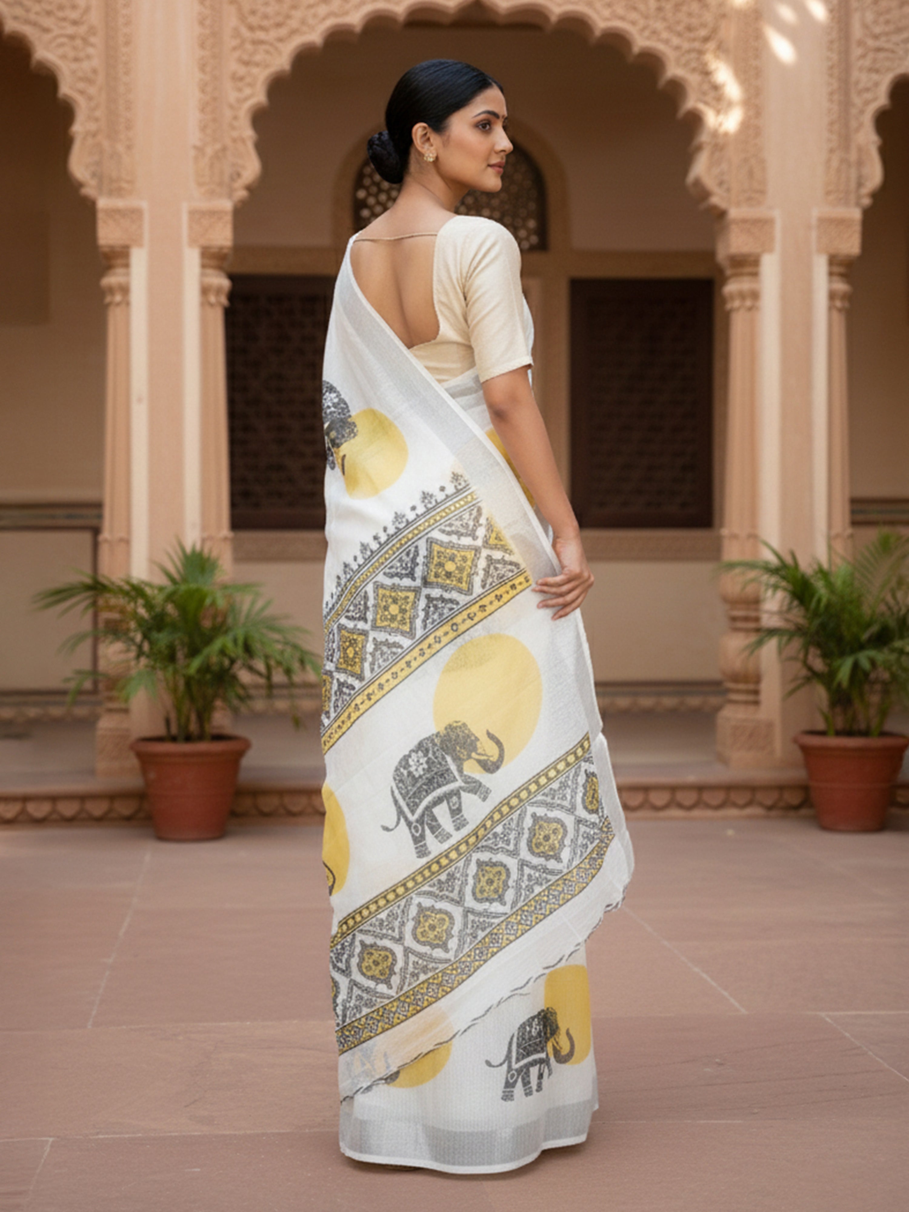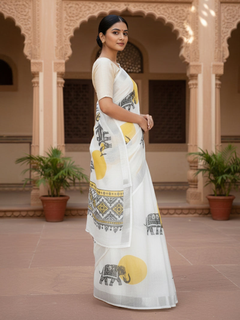 Graceful semi linen saree in white with elephant print and silver zari Bavanji border.