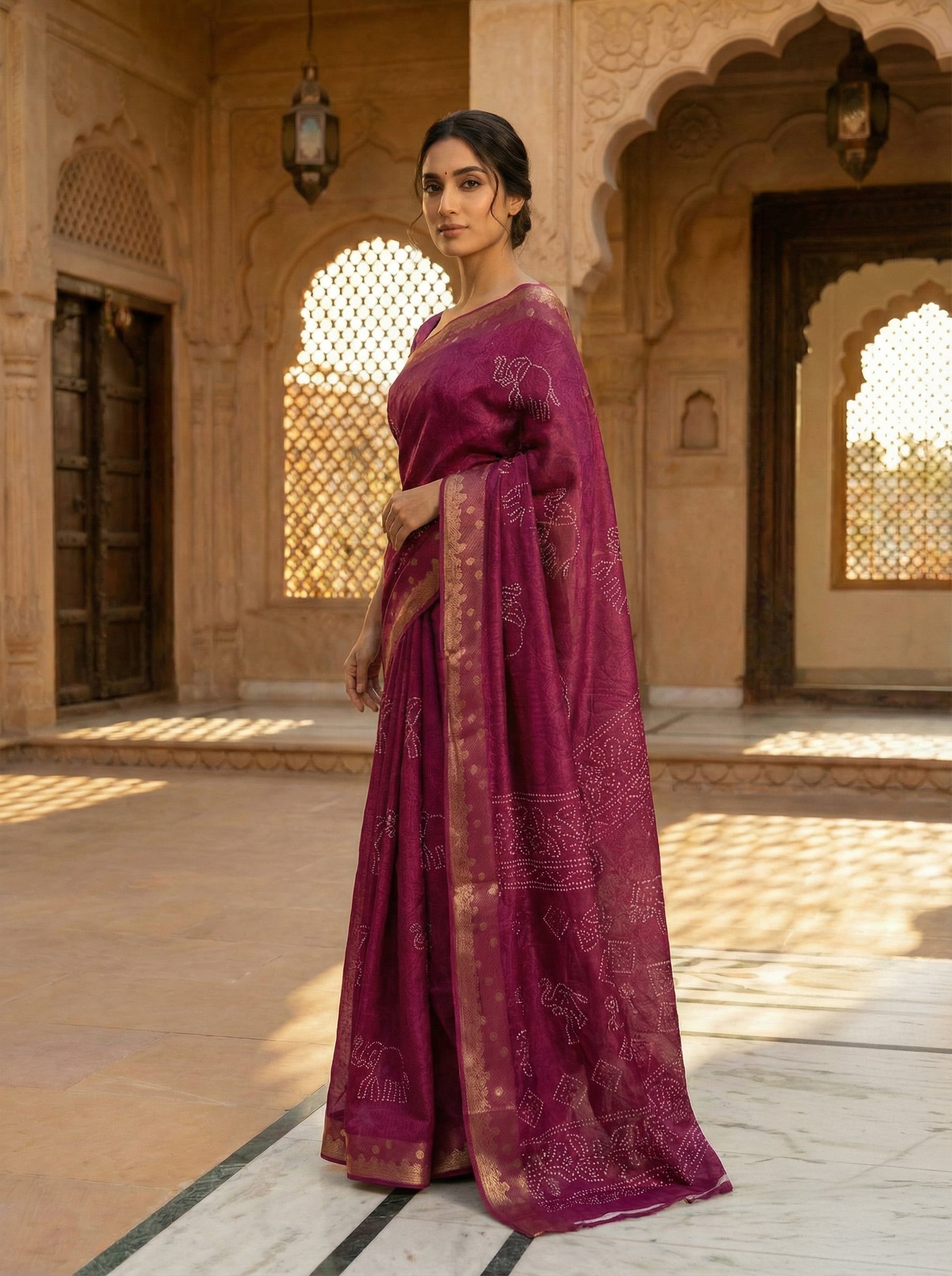 It comes paired with a matching Wine-colored blouse, featuring a delicate Butta design and measuring 75 cm, offering ample room for customization. The 5.5-meter saree length ensures a perfect and graceful drape suitable for all occasions.