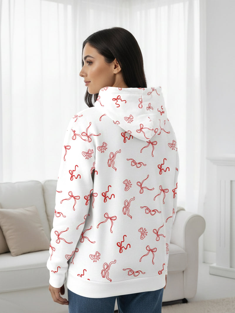 Women’s White Hooded Sweatshirt with Red Bow Print