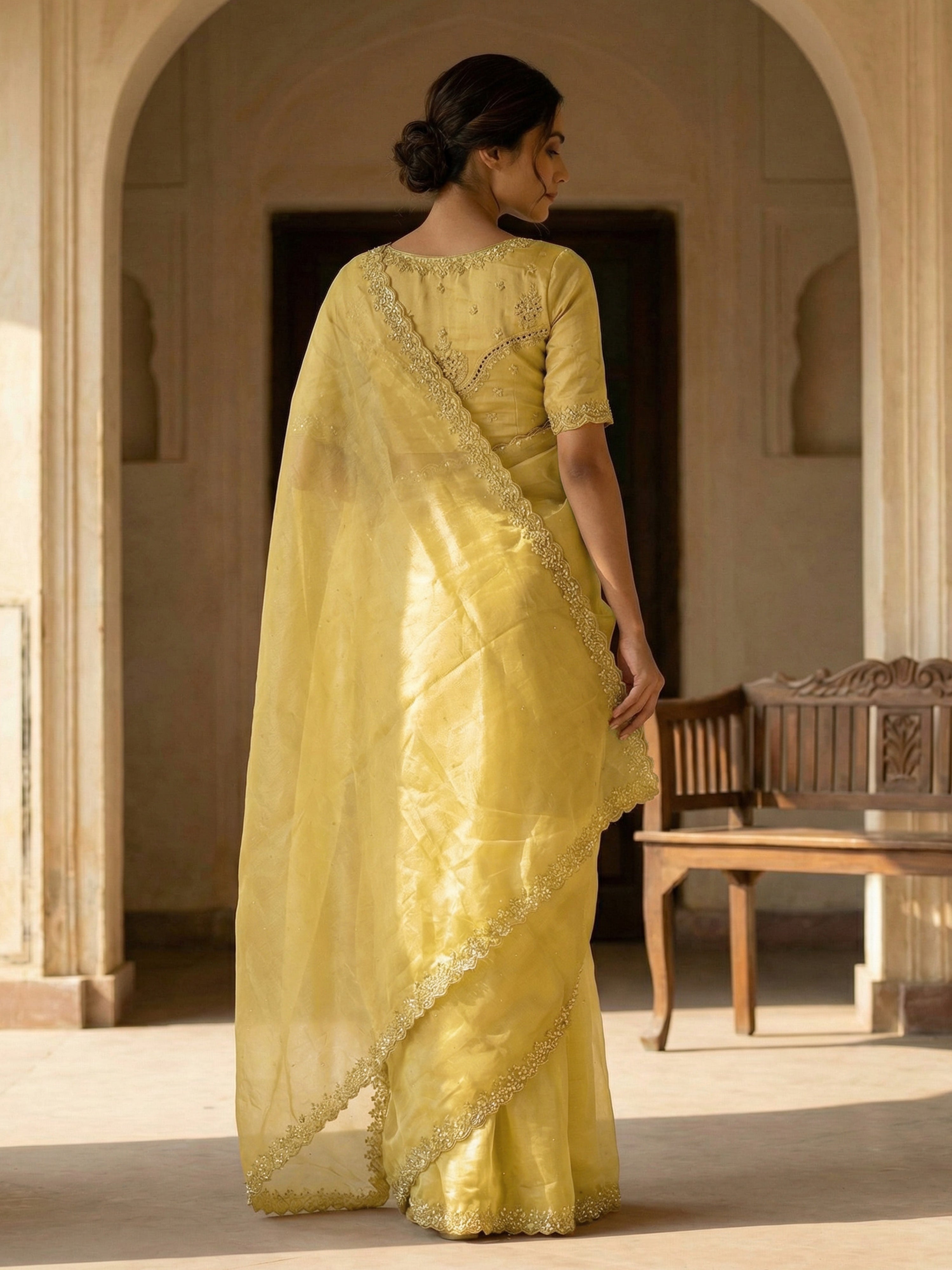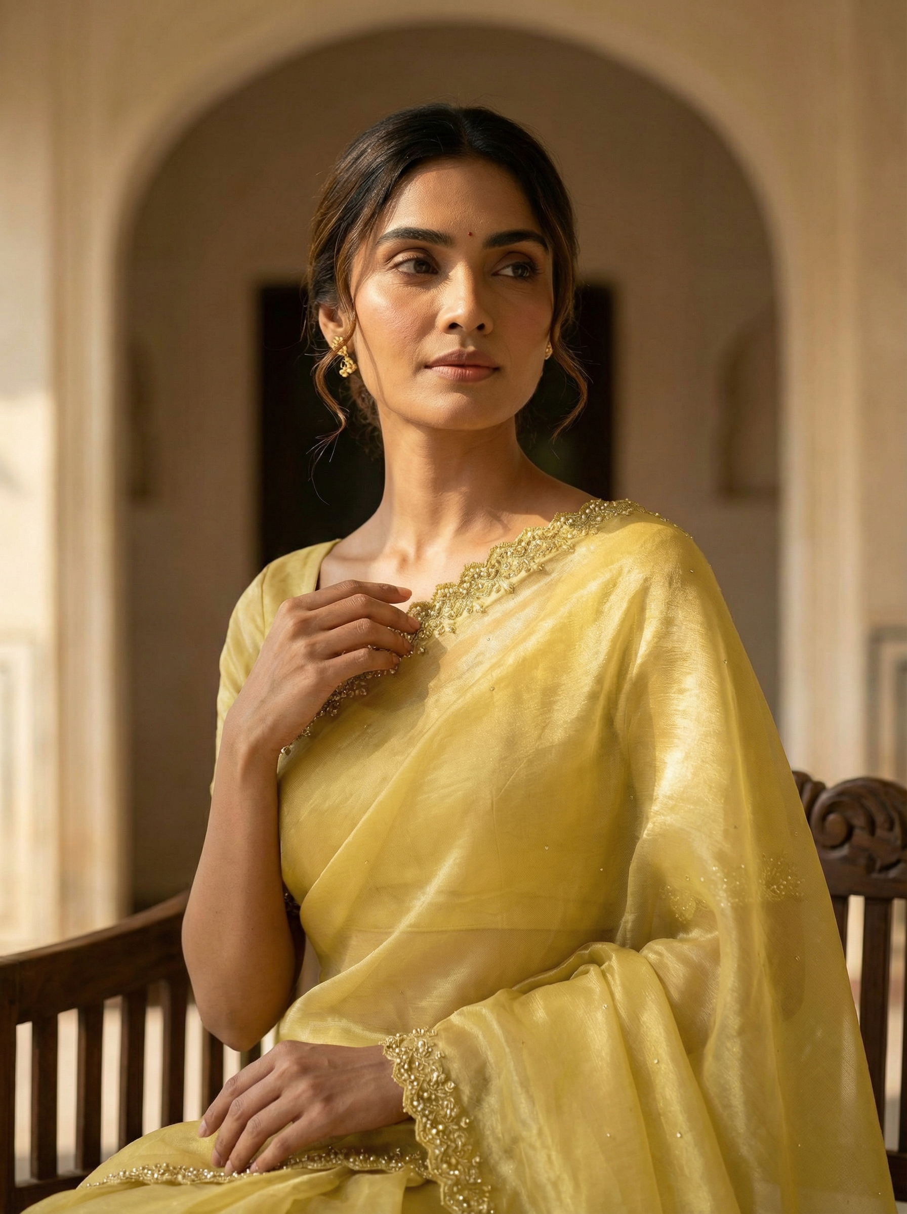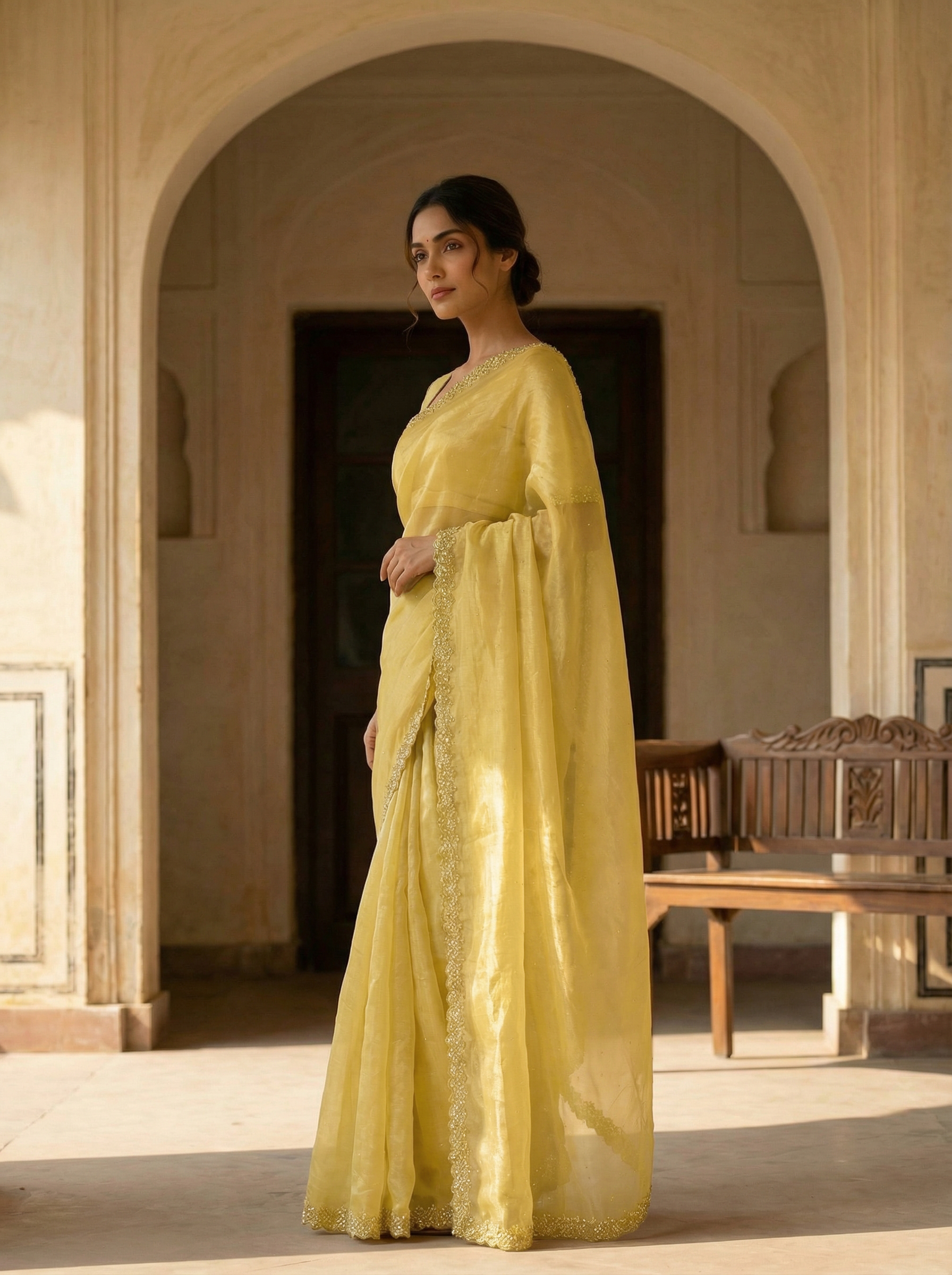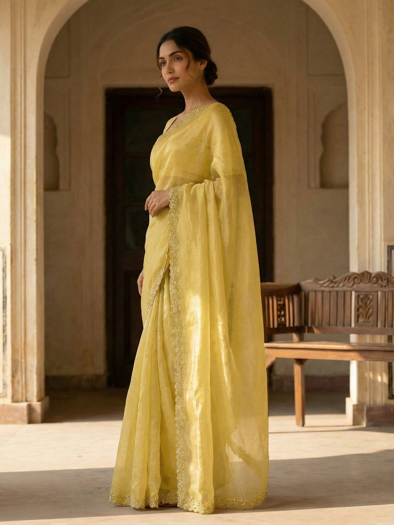 Yellow Designer Organza Saree with Spread Stone Work & Scalloped Stone-Shell Border